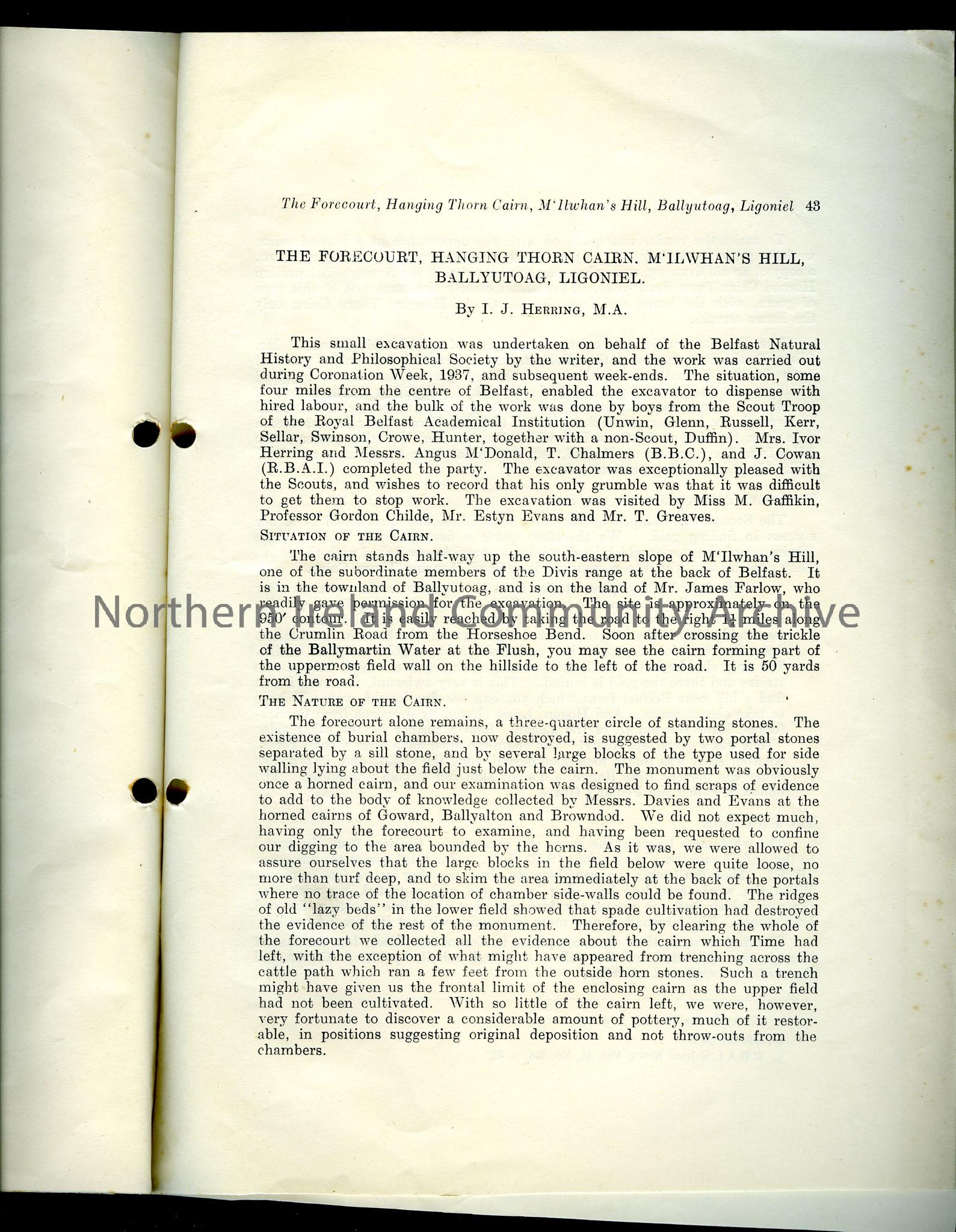 Pages marked 'With the compliments of I. J. Herring, Proceedings of B.N.H and P.S, And many thanks, I.J.H'. Contains illustrations titled 'Hanging Thorn Cairn Finds and Hanging Thorn Cairn Pottery'. Includes pages from a book/publication titled 'The Forecourt, Hanging Thorn Cairn, M'Ilwhan's Hill, Ballyutoag, Ligoniel by I.J.Herring M.A'.