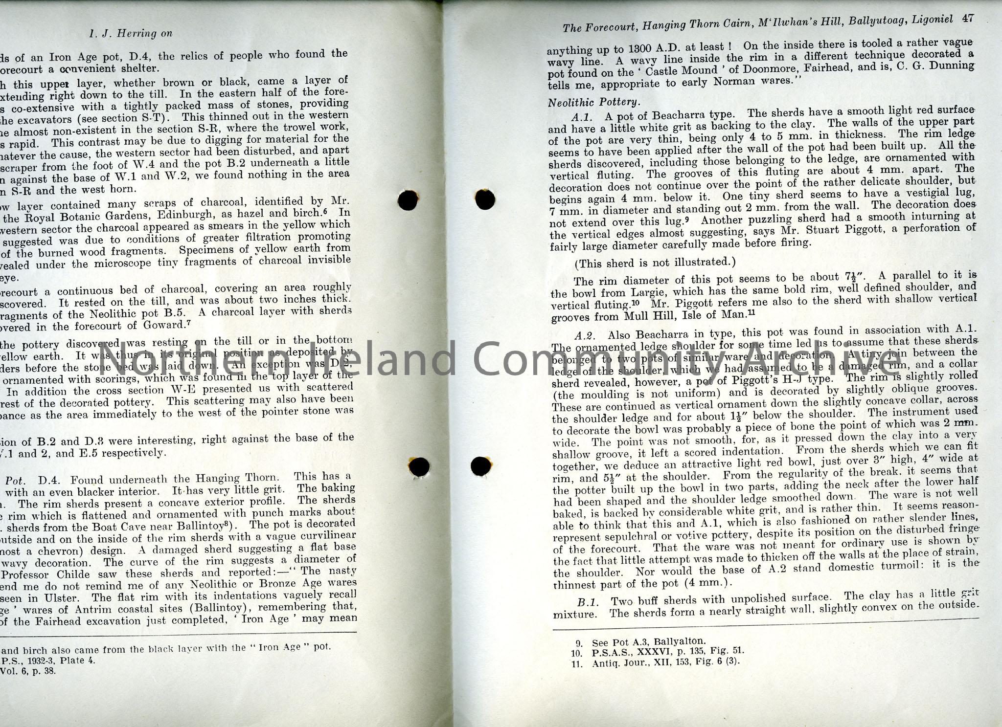 Pages marked 'With the compliments of I. J. Herring, Proceedings of B.N.H and P.S, And many thanks, I.J.H'. Contains illustrations titled 'Hanging Thorn Cairn Finds and Hanging Thorn Cairn Pottery'. Includes pages from a book/publication titled 'The Forecourt, Hanging Thorn Cairn, M'Ilwhan's Hill, Ballyutoag, Ligoniel by I.J.Herring M.A'.