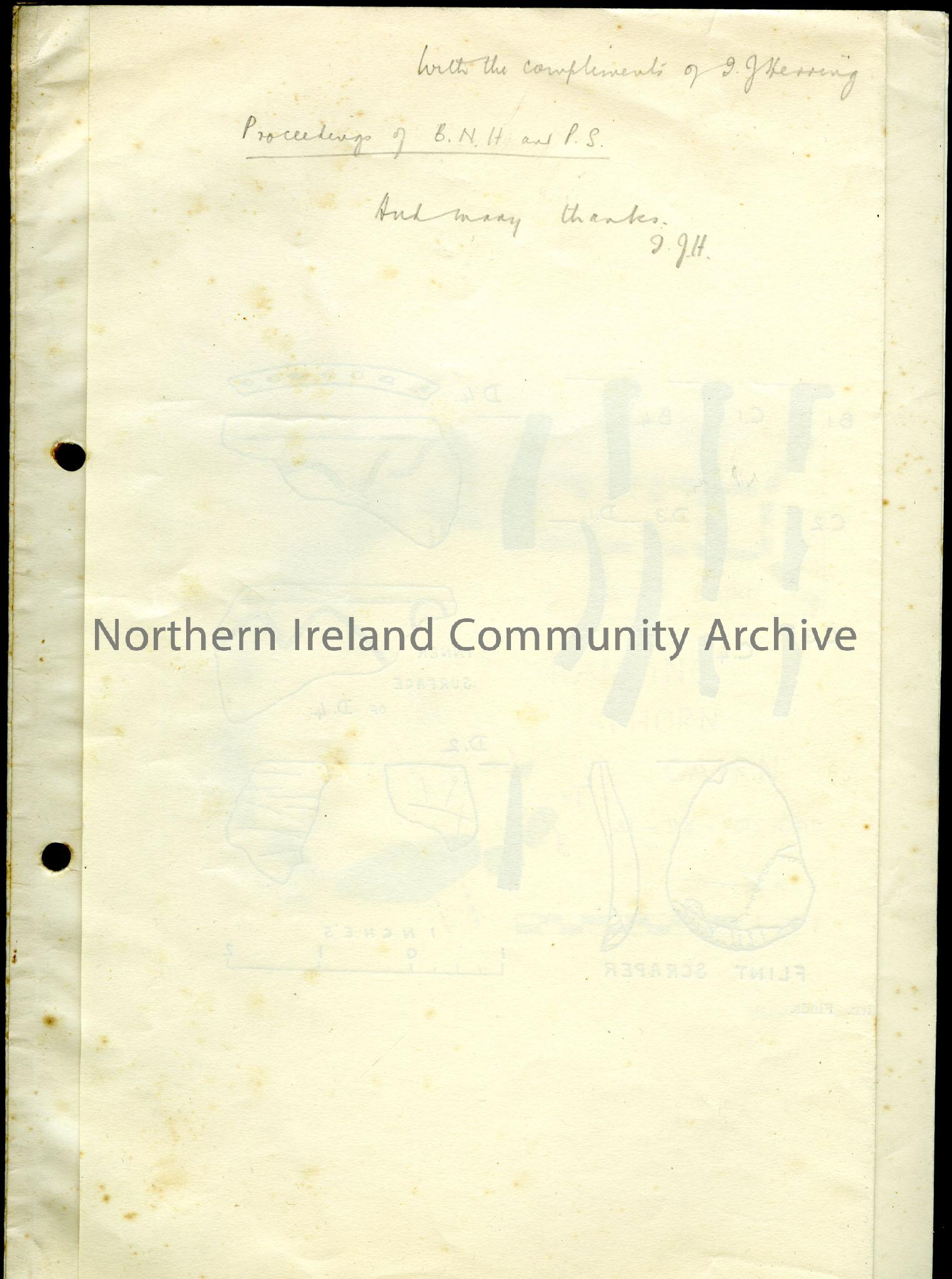 Pages marked 'With the compliments of I. J. Herring, Proceedings of B.N.H and P.S, And many thanks, I.J.H'. Contains illustrations titled 'Hanging Thorn Cairn Finds and Hanging Thorn Cairn Pottery'. Includes pages from a book/publication titled 'The Forecourt, Hanging Thorn Cairn, M'Ilwhan's Hill, Ballyutoag, Ligoniel by I.J.Herring M.A'.