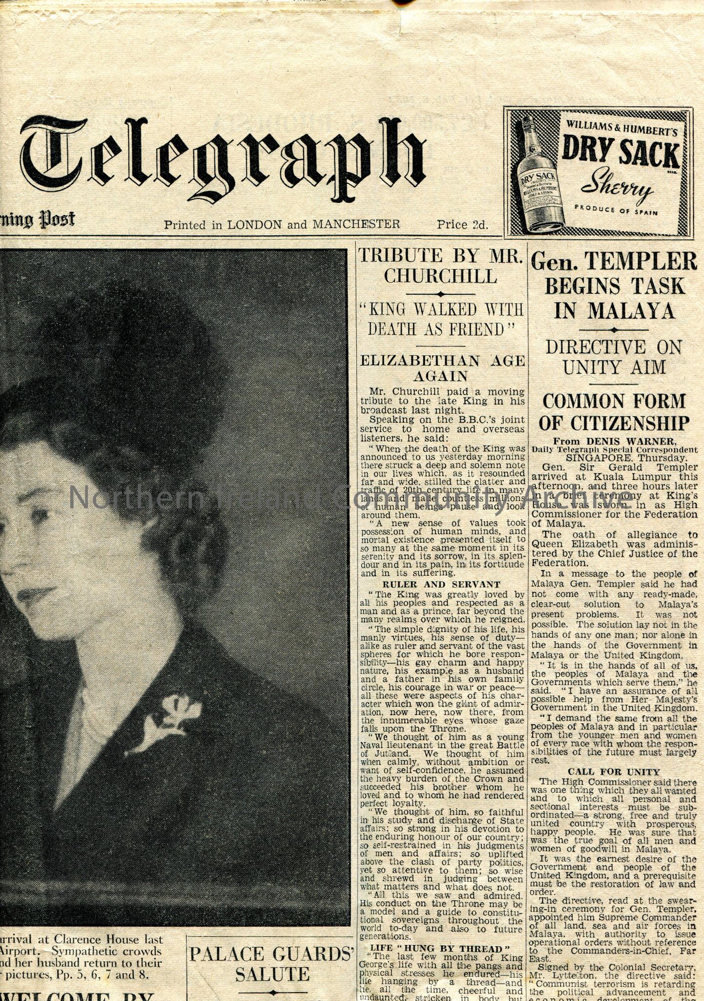 Pages of newspaper, 'The Daily Telegraph'. Dated Friday 8th February, 1952. Features a photographic image of Queen Elizabeth II with headlines re the recent death of her father, George VI.