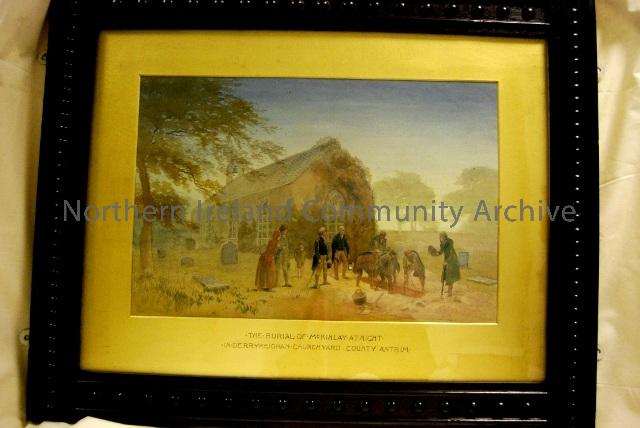 The Burial of McKinley painted by J W Carey. President McKinley of the USA was assassinated in 1901 and a McKinley Exhibition was held at St. Louis in 1904. J.W. Carey was commissioned to paint three pictures for the Exhibition by F J Bigger. 1. The Burning of the McKinley Home; 2. The Execution of Francis McKinley at Coleraine. 3. The Burial of McKinley at night in Derrykeighan Churchyard, Co. Antrim. McKinley was hanged on a tree in front of St. Patrick's Church, Church Street, Coleraine for being a suspected United Irishman. His wife obtained his body and he was buried at night at Derrykeighan since she did not want any fuss. William McKinley, 25th President of the USA was a relation. (Francis McKinley's Uncle James was the great-great-grandfather of President McKinley). The frame was made in the Irish Home Industries Workshop, Ballycastle. Courtesy of Ballycastle Museum.