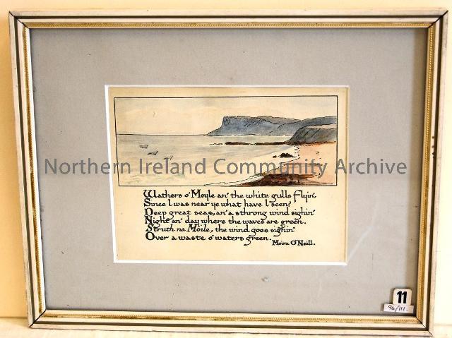An illustration of the poem ""Wathers of the Moyle"" by the poetess of the Glens, Moira O'Neill. Art work by Madge Gilmer. Moira O'Neill was the pen-name of Nesta Higginson, who was born at Rockport House, Cushendun (1864-1955). Courtesy of Ballycastle Museum.