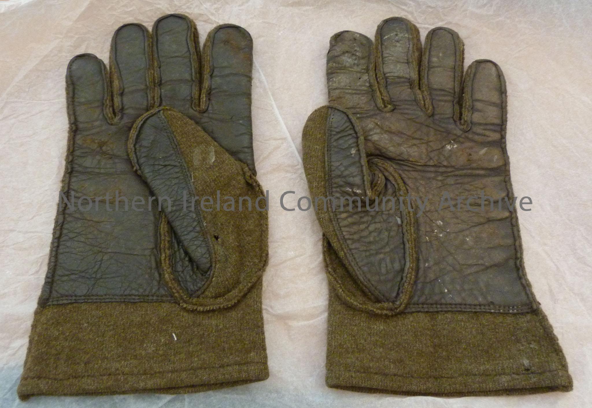 Pair of green wool gloves with brown leather palms
