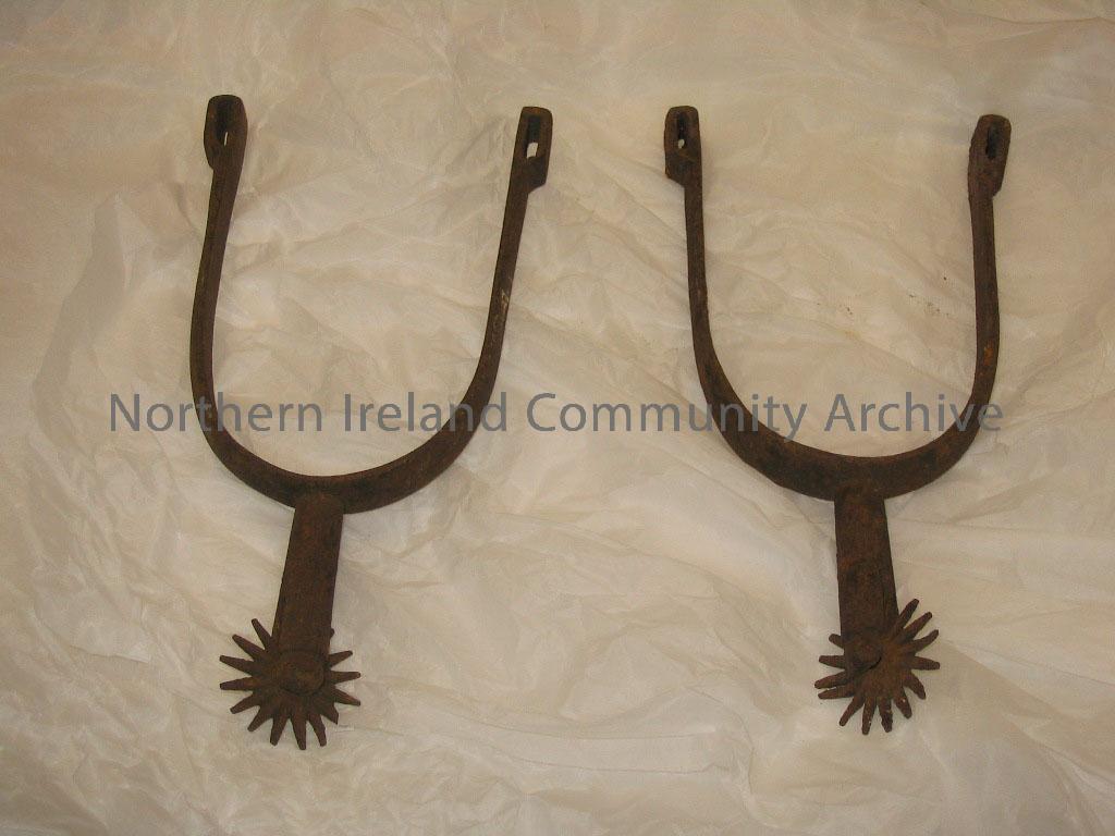 pair of spurs of Captain John Nevin, who led a local band of United Irishmen in the 1798 rebellion. He escaped to America, where he settled in Knoxville, Tennessee. Rowel spurs-sharp-toothed wheel inserted into the end of the shank of each spur