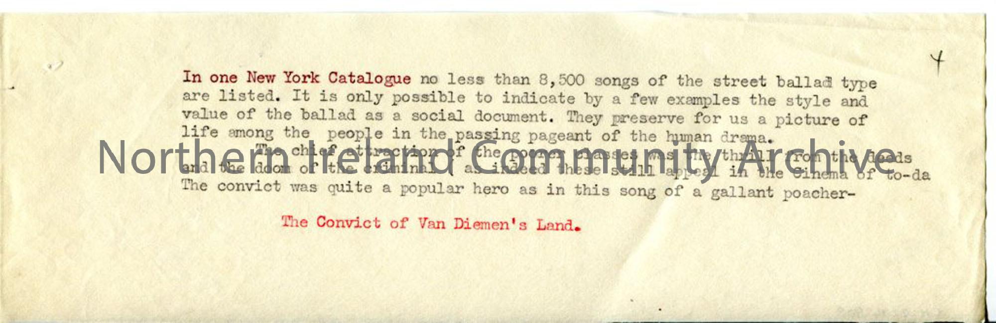 Typed paragraph re: New York street ballad - ? part of whole script on ballads. Number '4' handwritten top right.