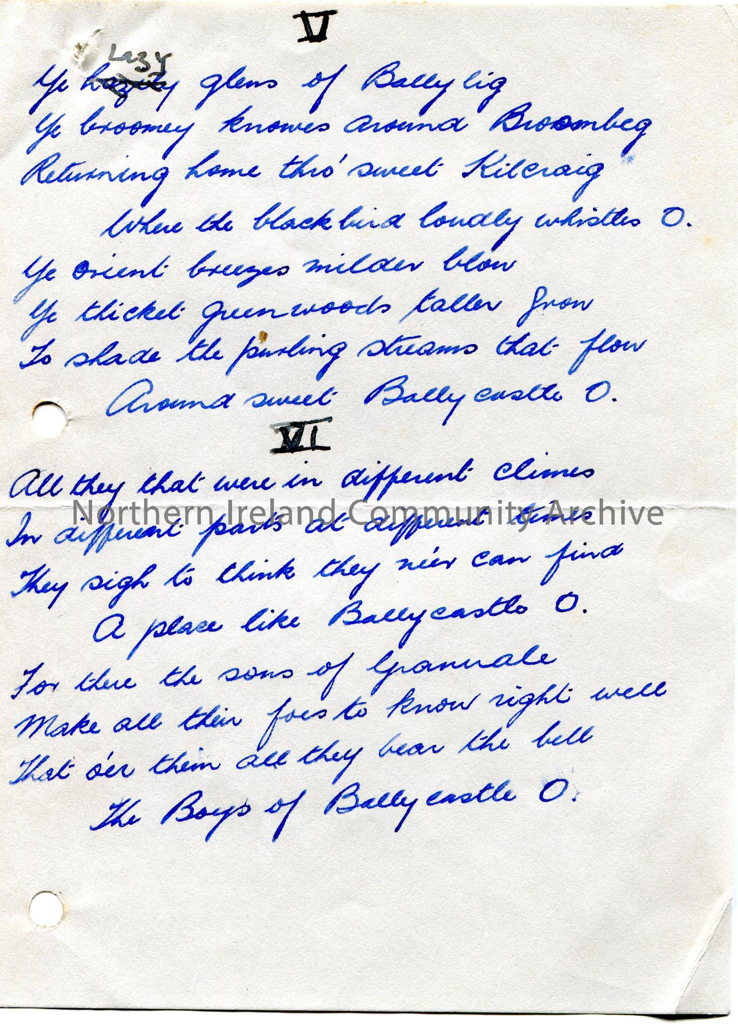 Part 2 of 3. Handwritten six verse song titled, 'Ballycastle O'. Mentions Ballylig, Broombeg and Kilcraig.