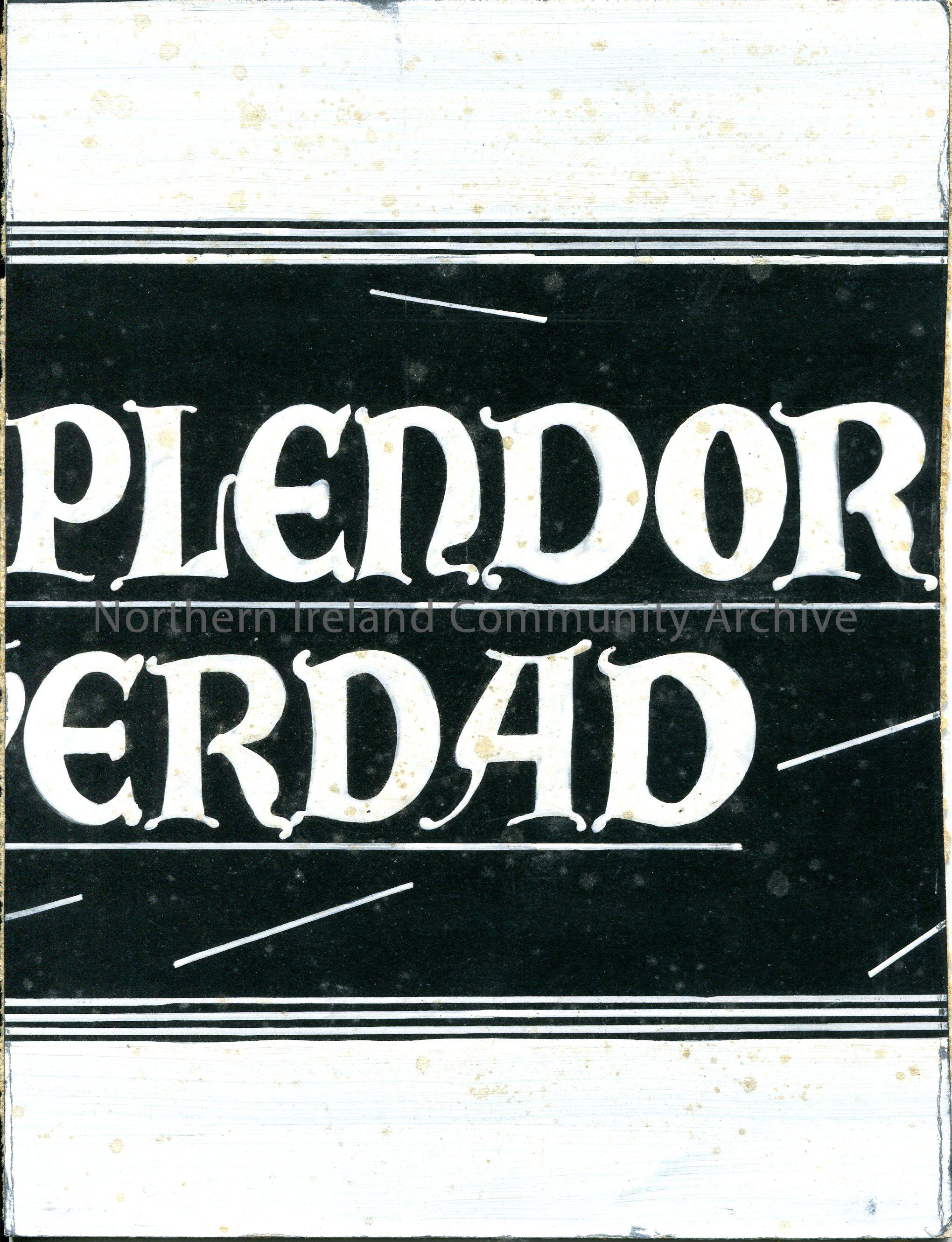 Part of a black and white painted sign onto card. Partly reads, ‘PLENDOR…ERDAD’. Handwritten in pencil on reverse, ‘Volutes, Vennels, Radial Grooves…