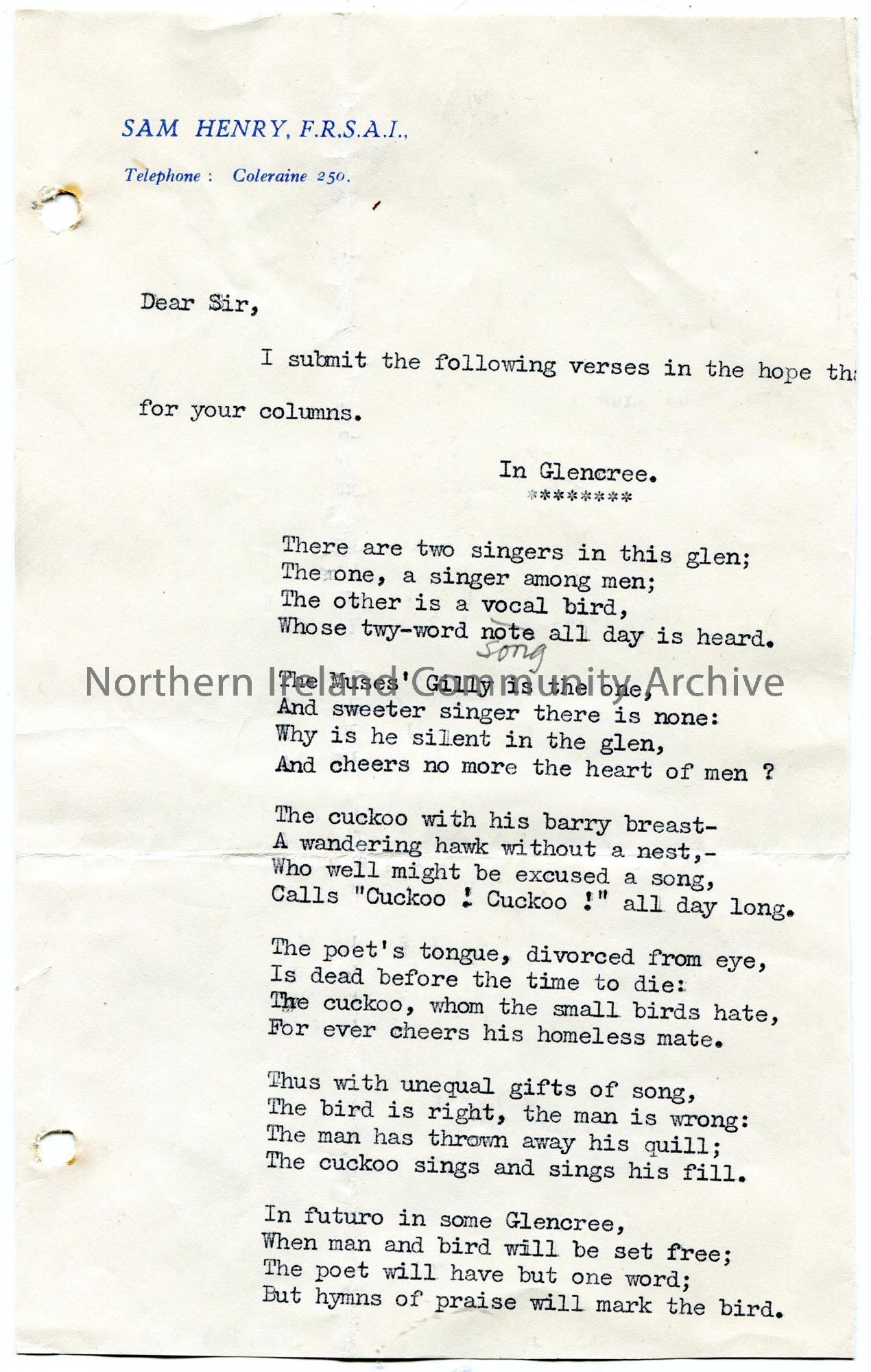 Part of a letter from Sam Henry to ‘Dear Sir’. Includes verses of a poem or song titled, ‘In Glencree’. Sam is hoping the verses will be used in a col…