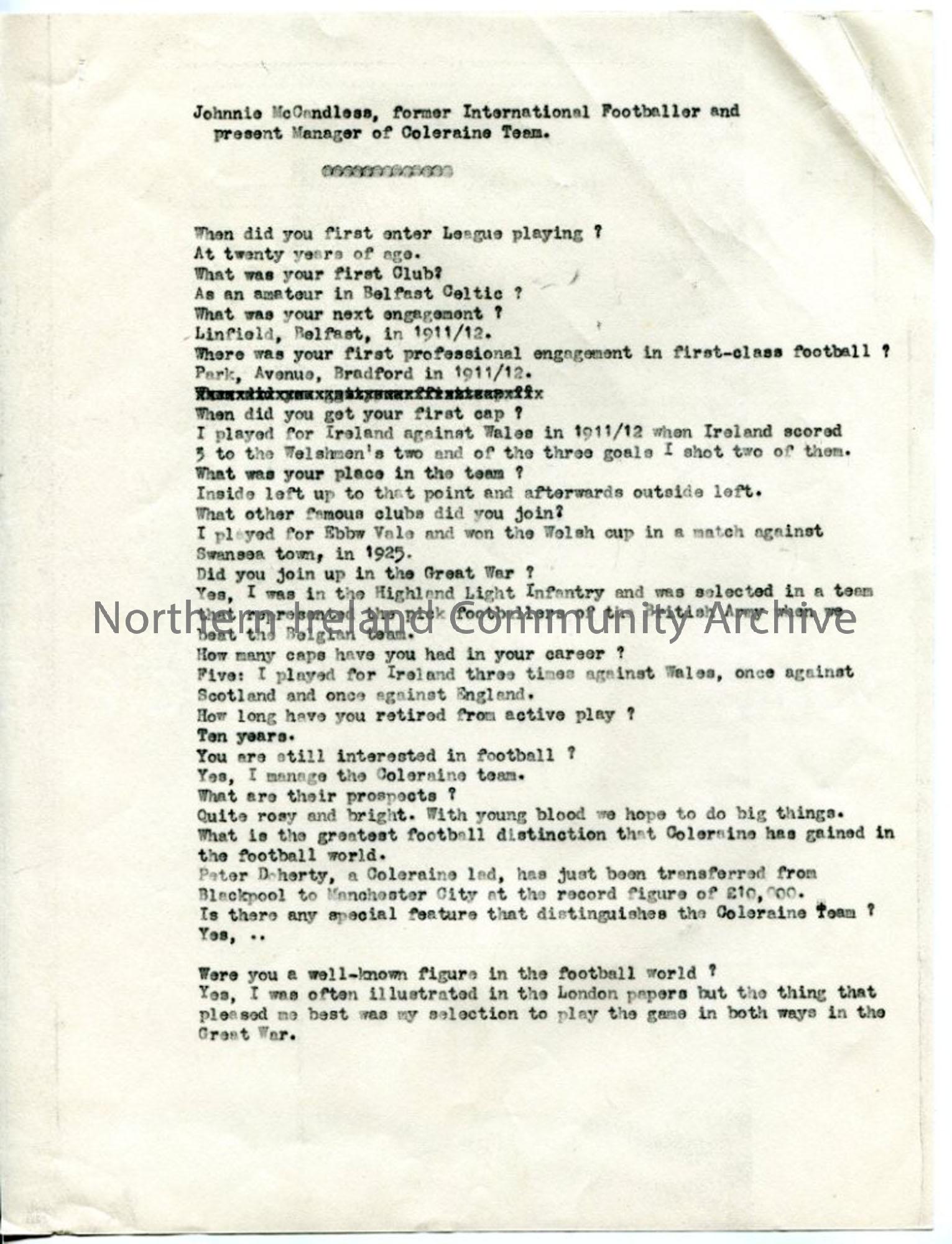 Appears to be part of the script for the 'Provincial Journey' programme broadcast from Coleraine Town Hall. Script for interview with Johnnie McCandless - international footballer and manager of Coleraine Football team.