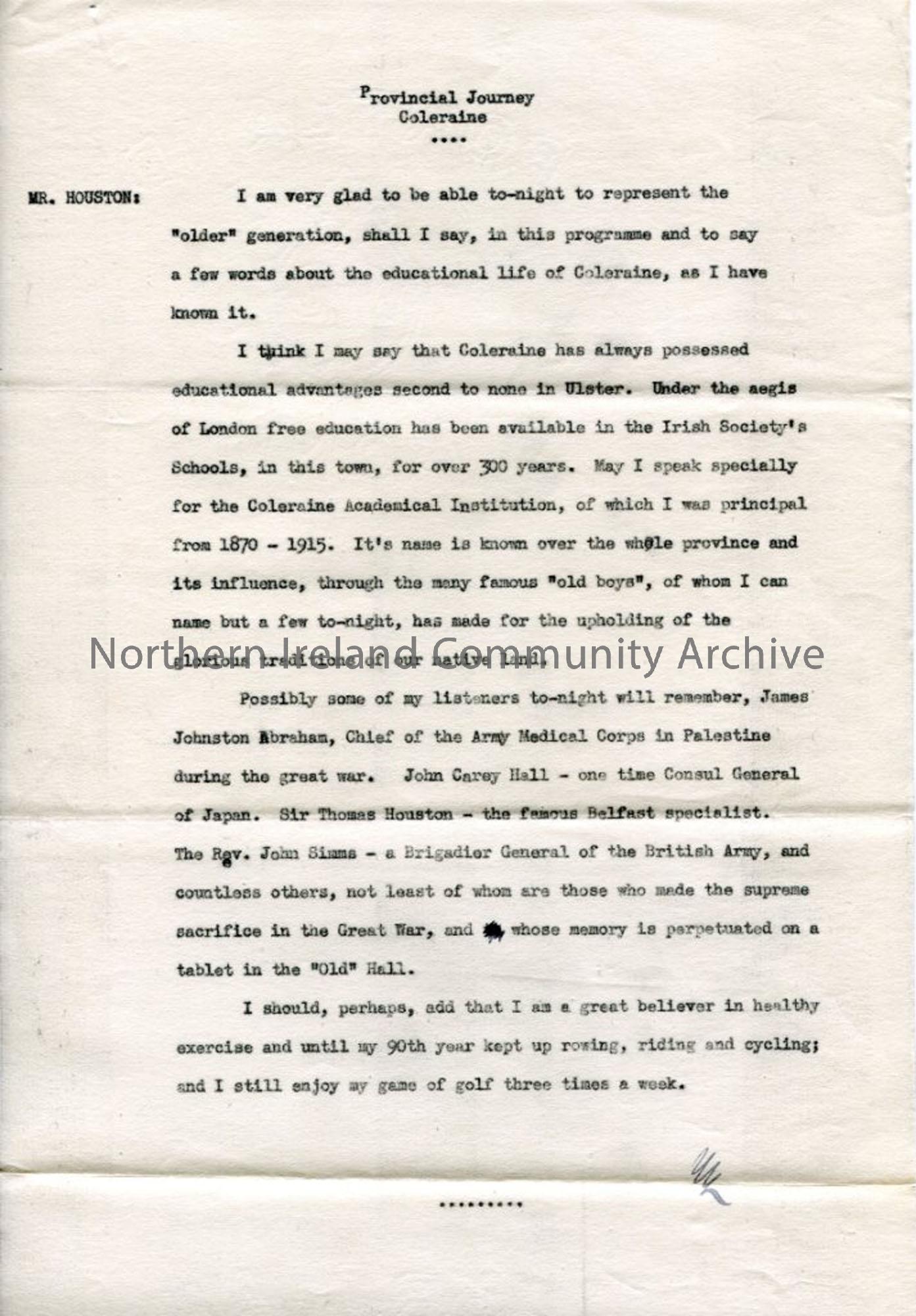Appears to be part of the script for the 'Provincial Journey' programme broadcast from Coleraine Town Hall. Presentation of T G Houston on educational life of Coleraine.