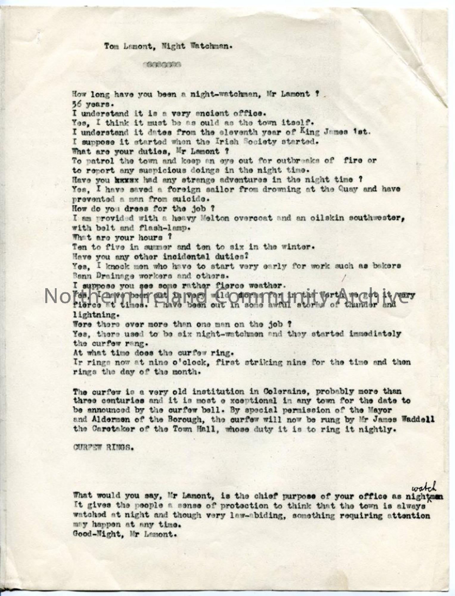 Part of the script for the 'Provincial Journey' programme broadcast from Coleraine Town Hall. Interview of Tom Lamont, the night watchman - his duties, hours. Talks of Curfew bell, which announces time and date.