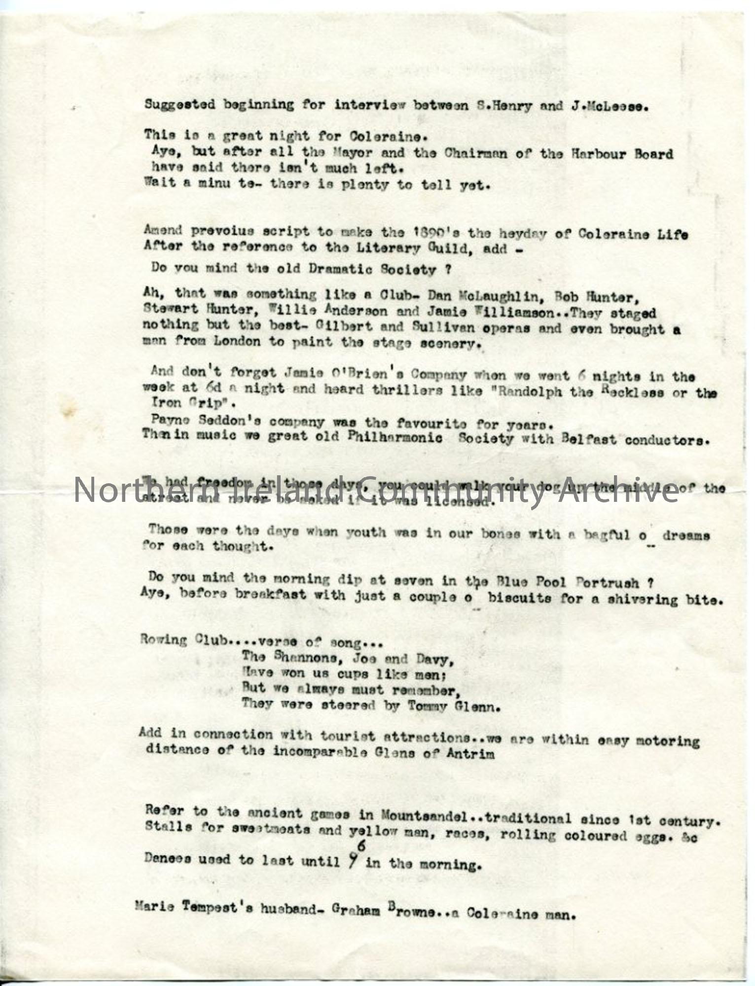Appears to be part of the script for the 'Provincial Journey' programme broadcast from Coleraine Town Hall. Suggested beginning for interview between Sam Henry and Johnnie McAleese and amendments for earlier interview script.