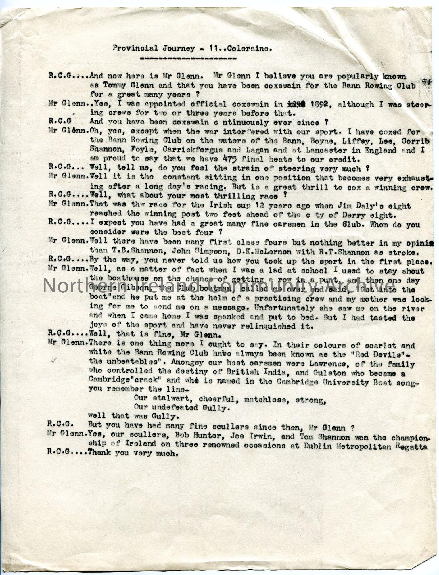 Part of the script for the 'Provincial Journey' programme broadcast from Coleraine Town Hall. Interview between RCG (? Glendenning of BBC) and a Tommy Glenn, about Coleraine Boat Club. This does not appear on preliminary programme schedule CM:2014:860