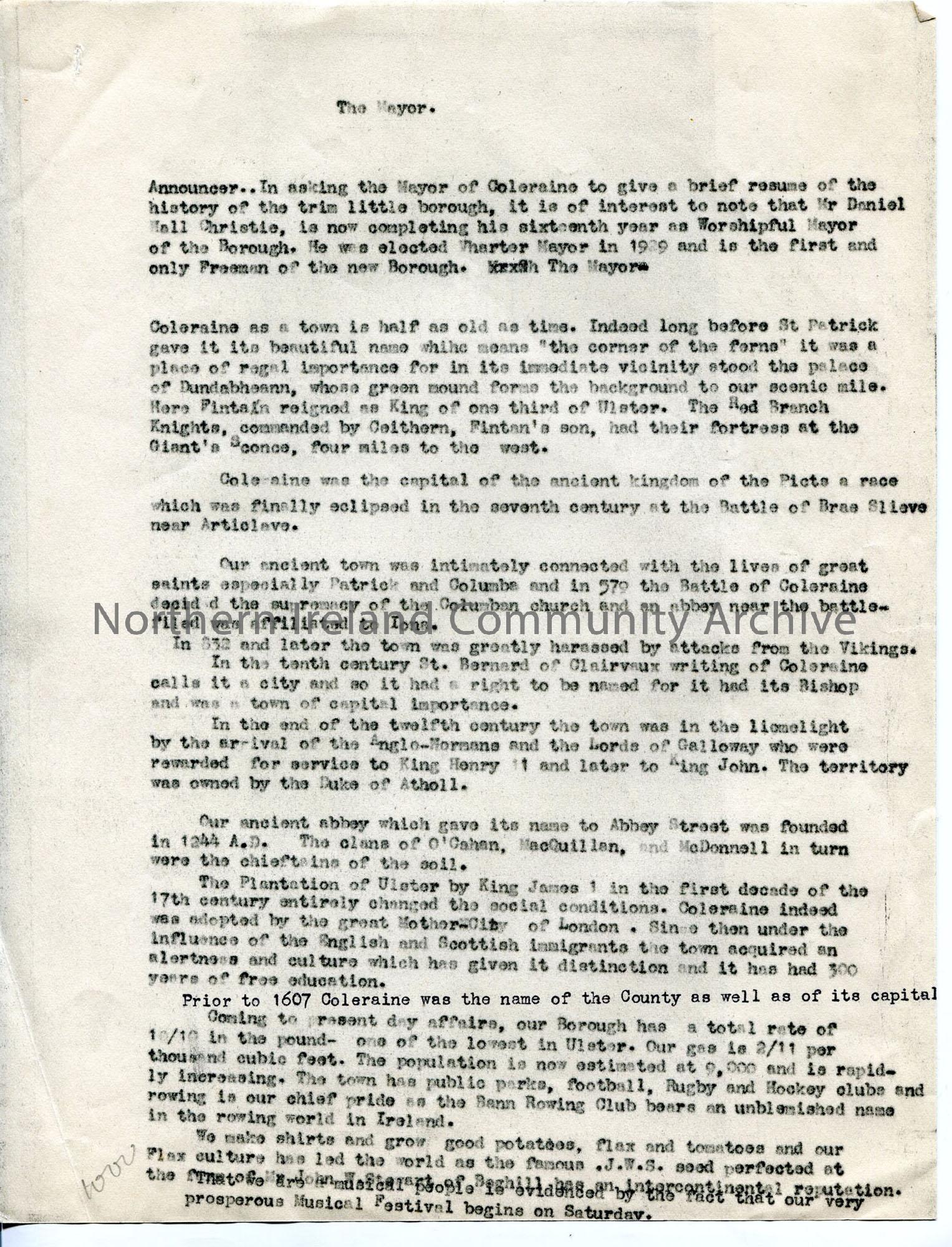 Part of the script for the 'Provincial Journey' programme broadcast from Coleraine Town Hall, with scribbled pencil notes. A script for Mayor Daniel Christie, giving history of town
