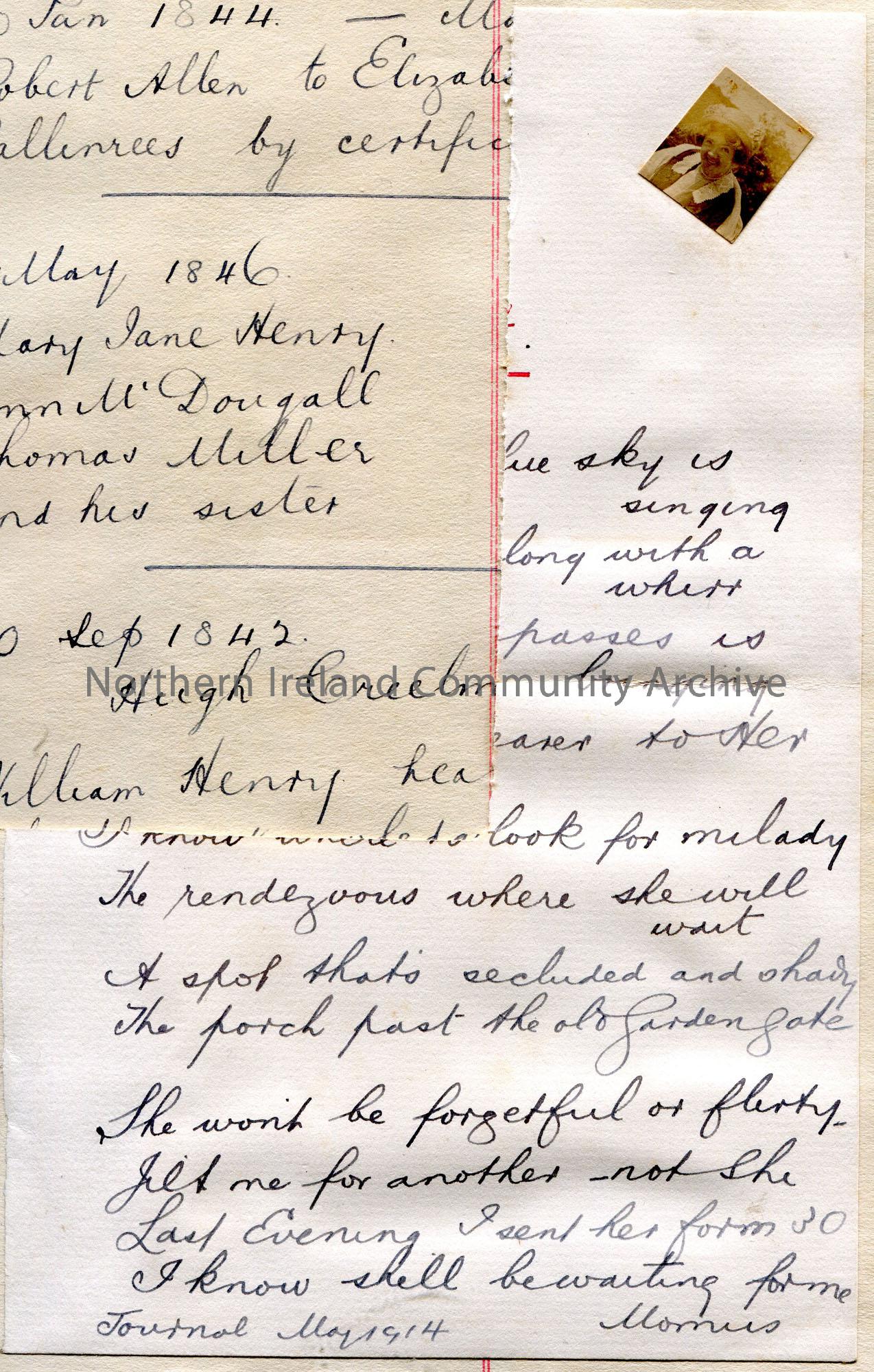 Part of what appears to be a poem handwritten onto white paper. [Top left section has been cut away]. Signed 'Momus' dated Journal May 1914. A very small photographic image is pasted diagonally to the top right corner of Sam Henry's wife, Maimie.