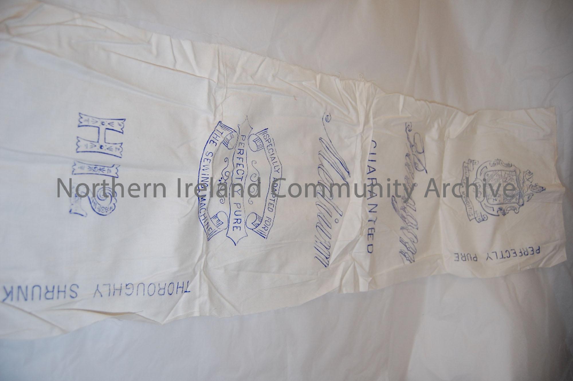 Pat Brown- Edwardian linen pieces. White fabric cuttings of various sizes. One was stamped with the words Paragon Medium- specially adapted for the se…