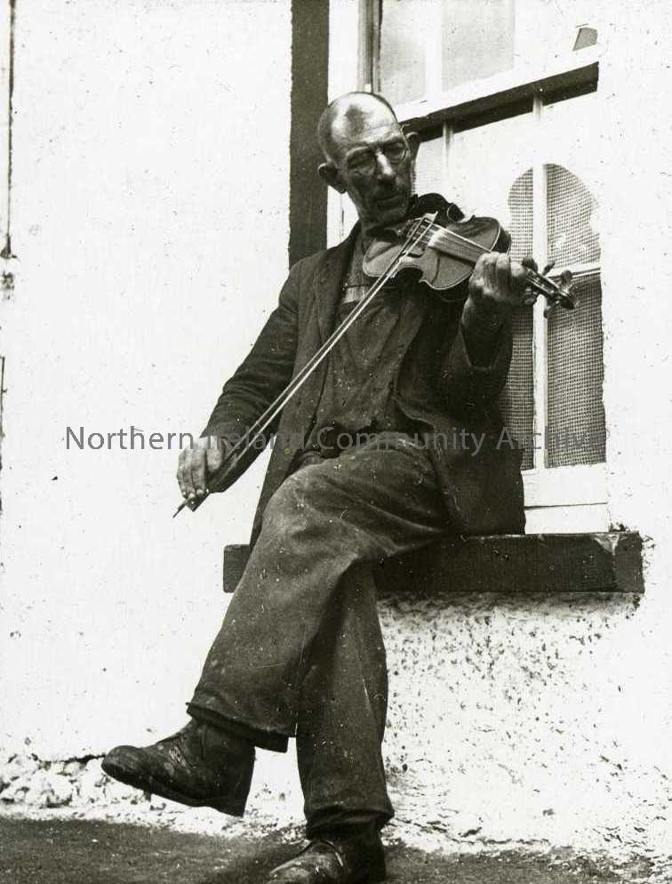 Man (Pat Kealey) sitting on outside window sill playing fiddle. See also L:2010:1.237 (JM - used by Sam Henry in Broadcasts in 1930s and 1940s - Henry noted that, on that account, he was well regarded as a fiddler in Kintyre. almost certainly a nephew of the Kealeys of Ballysally and cousin of Ballymoney fiddler James Kealey.The Ballysally Kealeys lived near the present day Ballysally roundabout, though originally from Dungiven).