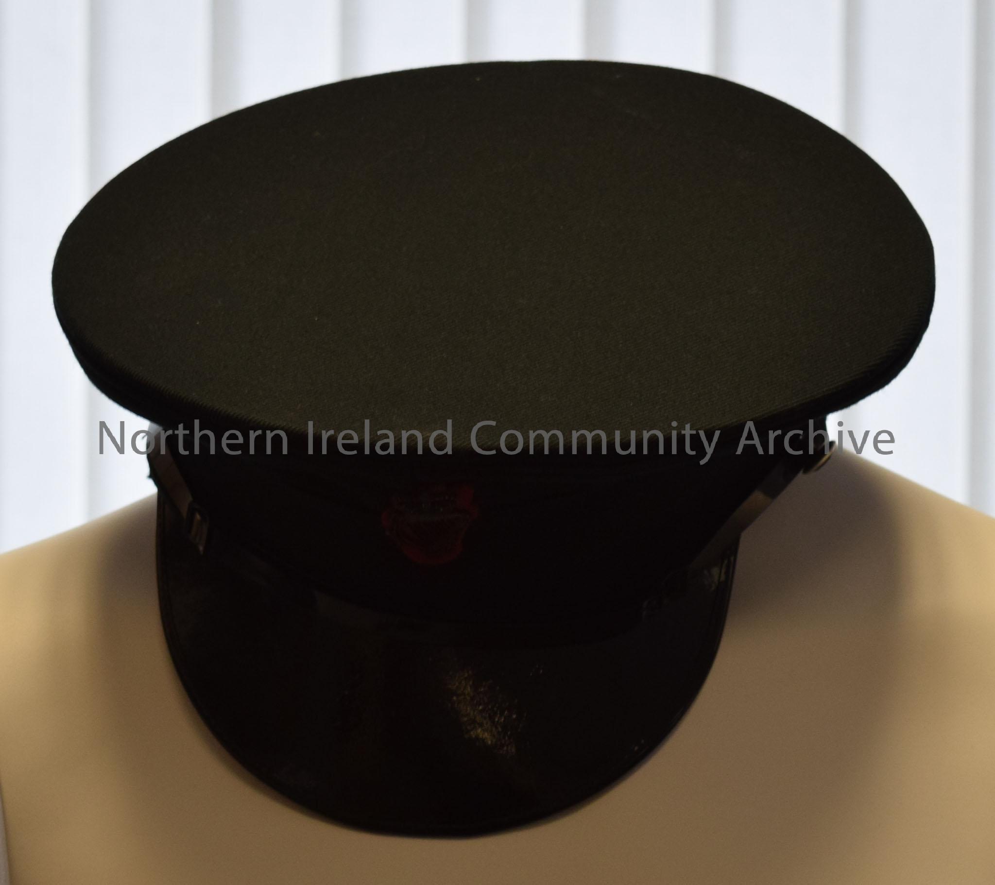 Peaked cap worn by members of the Royal Ulster Constabulary. Dark green with black peak and brass harp with red background on the front.