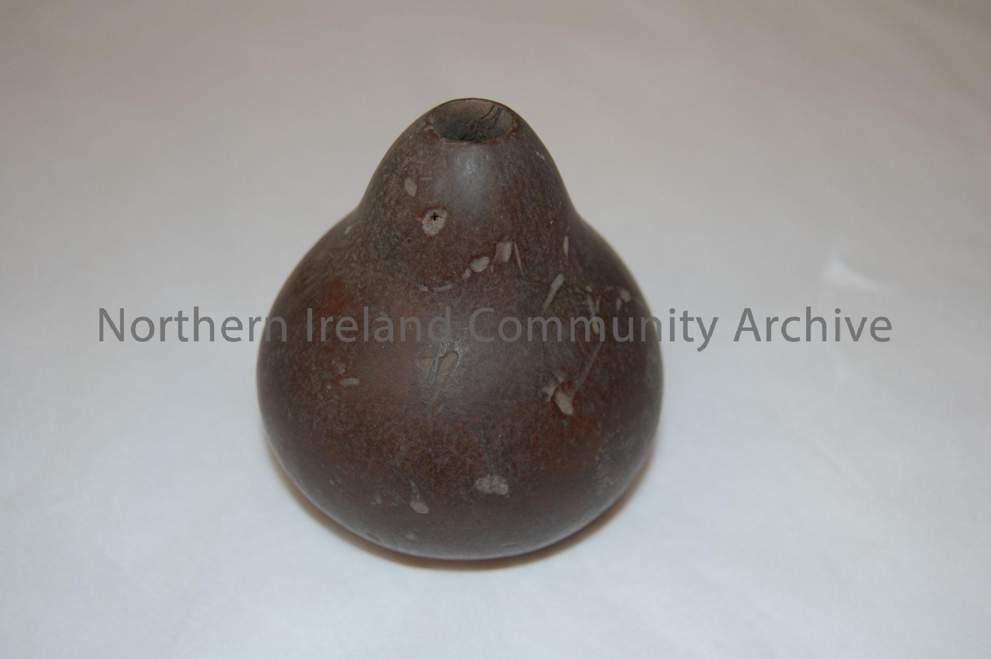 Pear shaped hollow wooden vessel with a hole at...