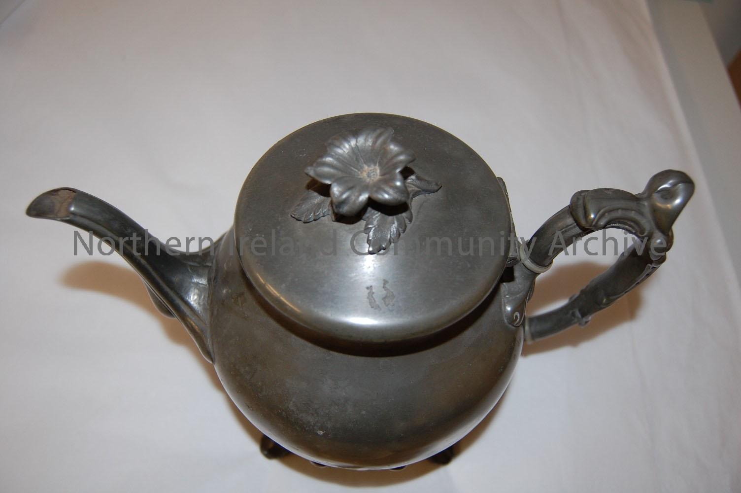 Pear shaped pewter coloured teapot with a plain...