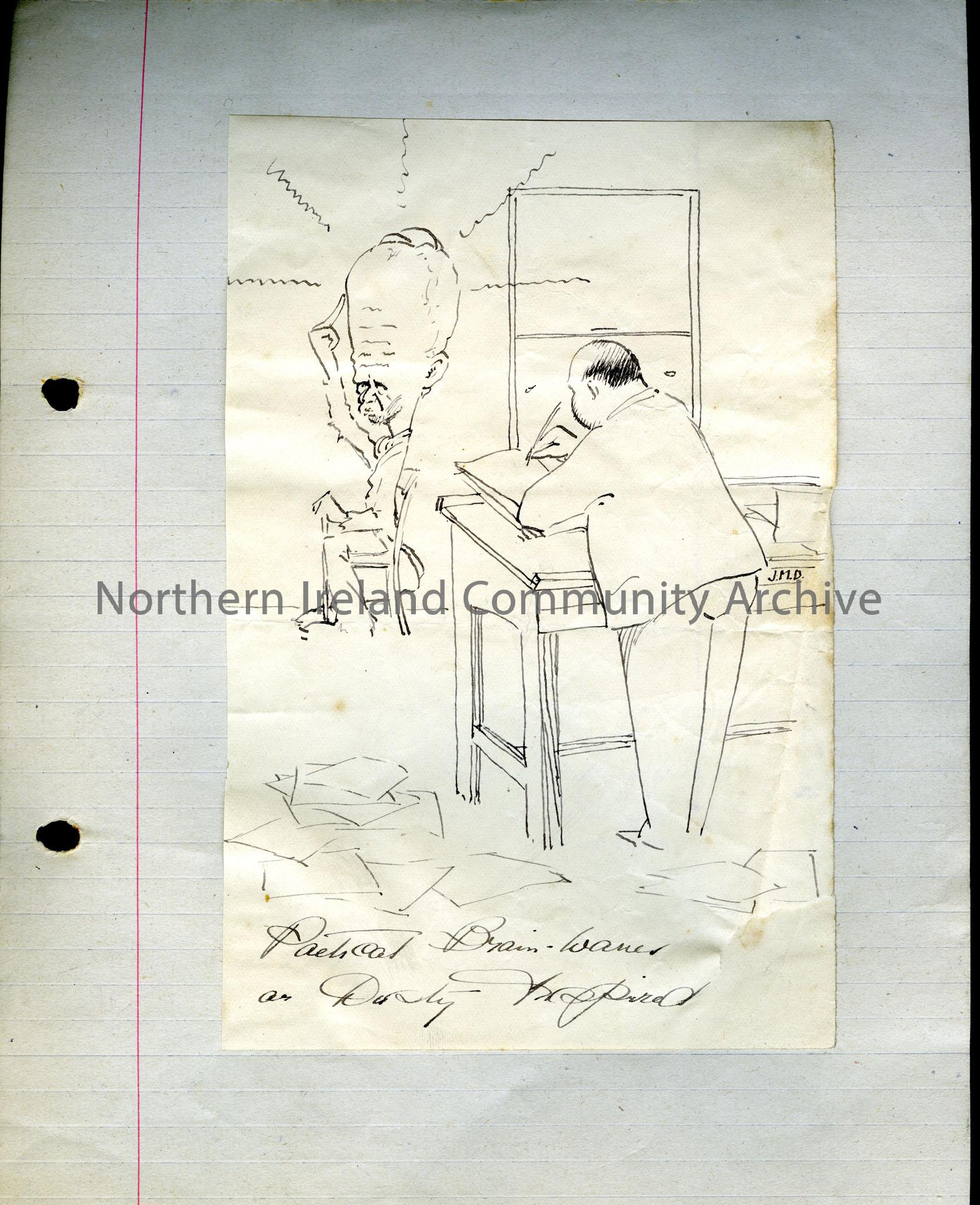 Pen line drawing - man writing (Sam Henry?), another man sitting on a chair with an enlarged head. Captioned 'Practical Brain - ?' or ? ?? Initialed J. M. D