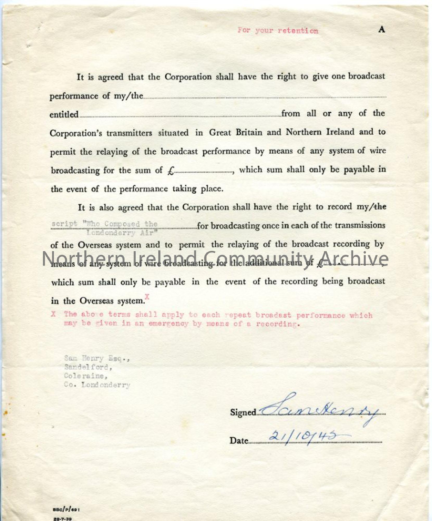 Standard typed permission slip for use of material broadcast, with Sam Henry's particular's and signature.