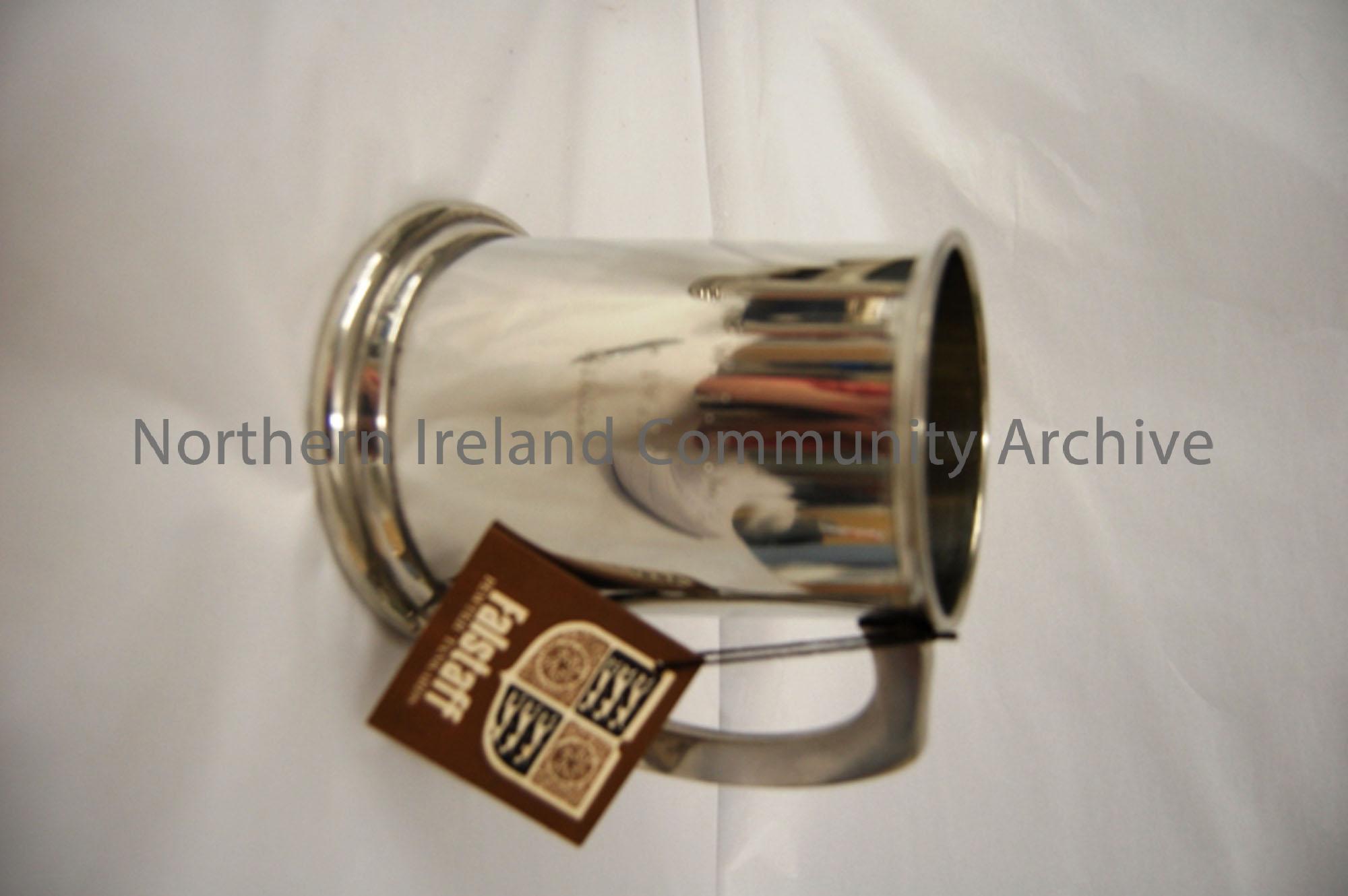 pewter tankard with handle on right side. Inscribed N.W.I.B.L 1971 singles. has original tag on it which gives instructions on how to care for the tankard.