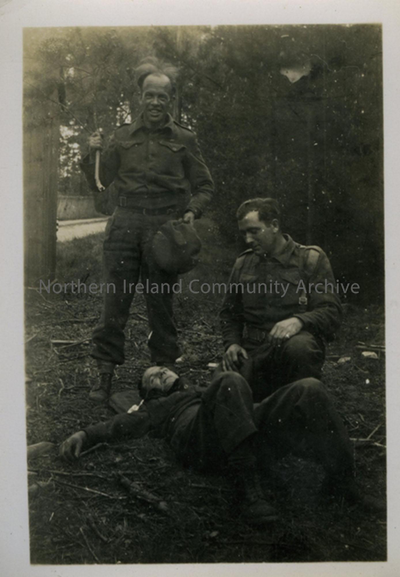 Photo of 3 soldiers. G Stewart standing holding a stick. Bobby Graham kneeling down. Identity of man on the ground unknown.