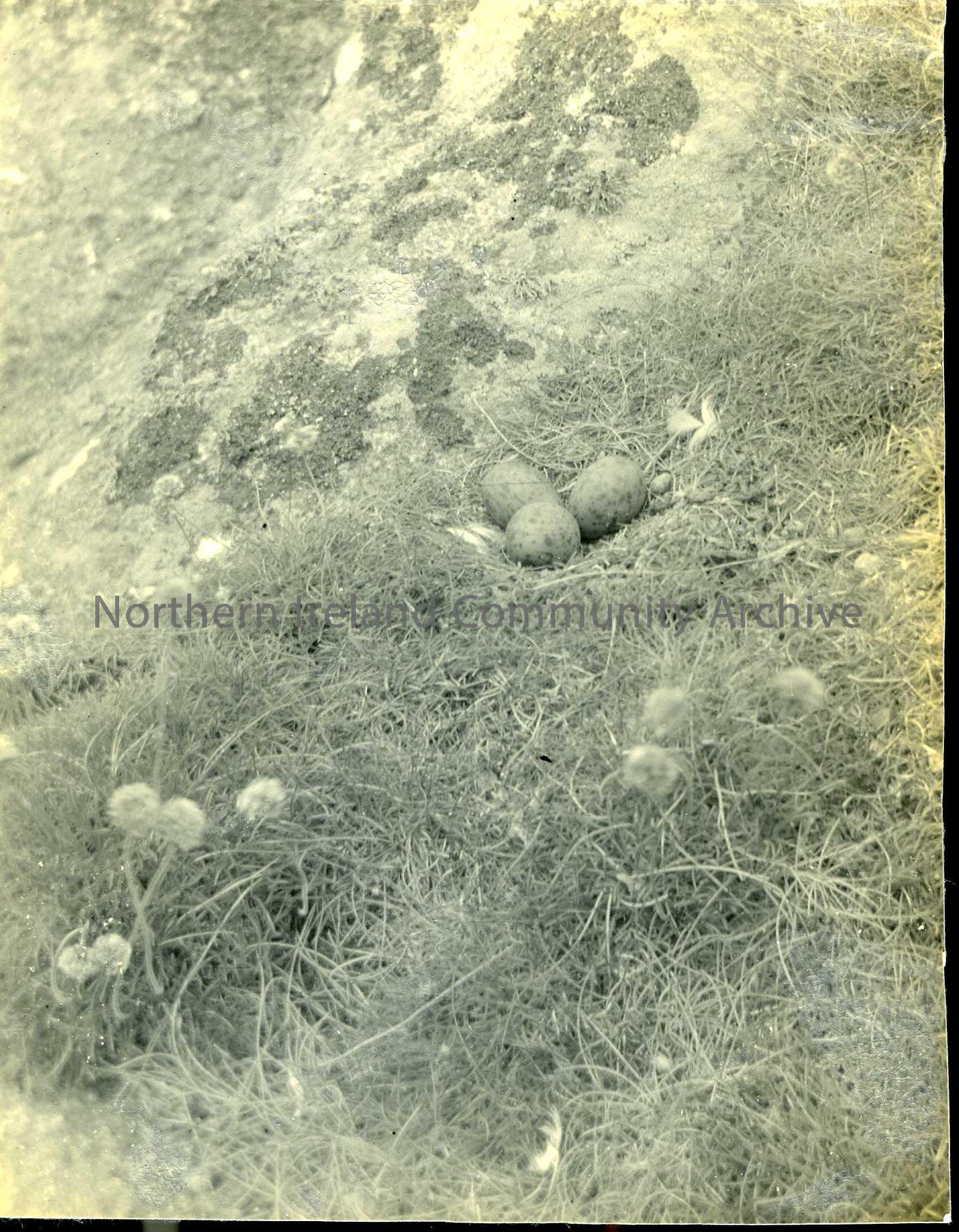 Photo of a nest with eggs on what looks like a cliff edge at the sea as there are sea pinks in the foreground.