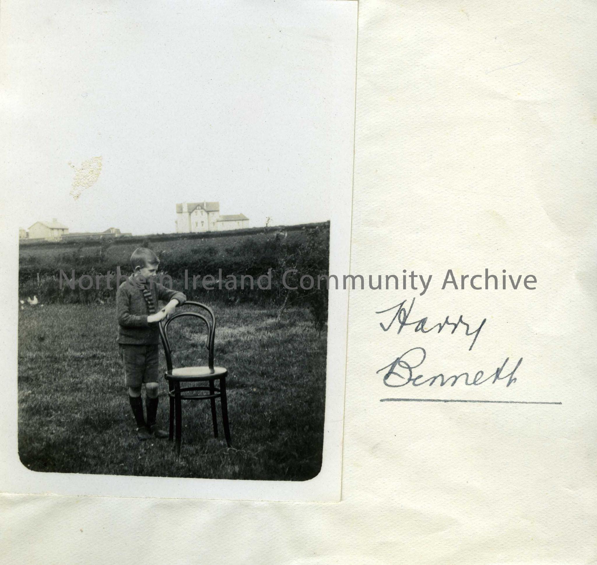 Photo of a young boy posed beside a chair in a garden. Harry Bennett is written beside the photo.