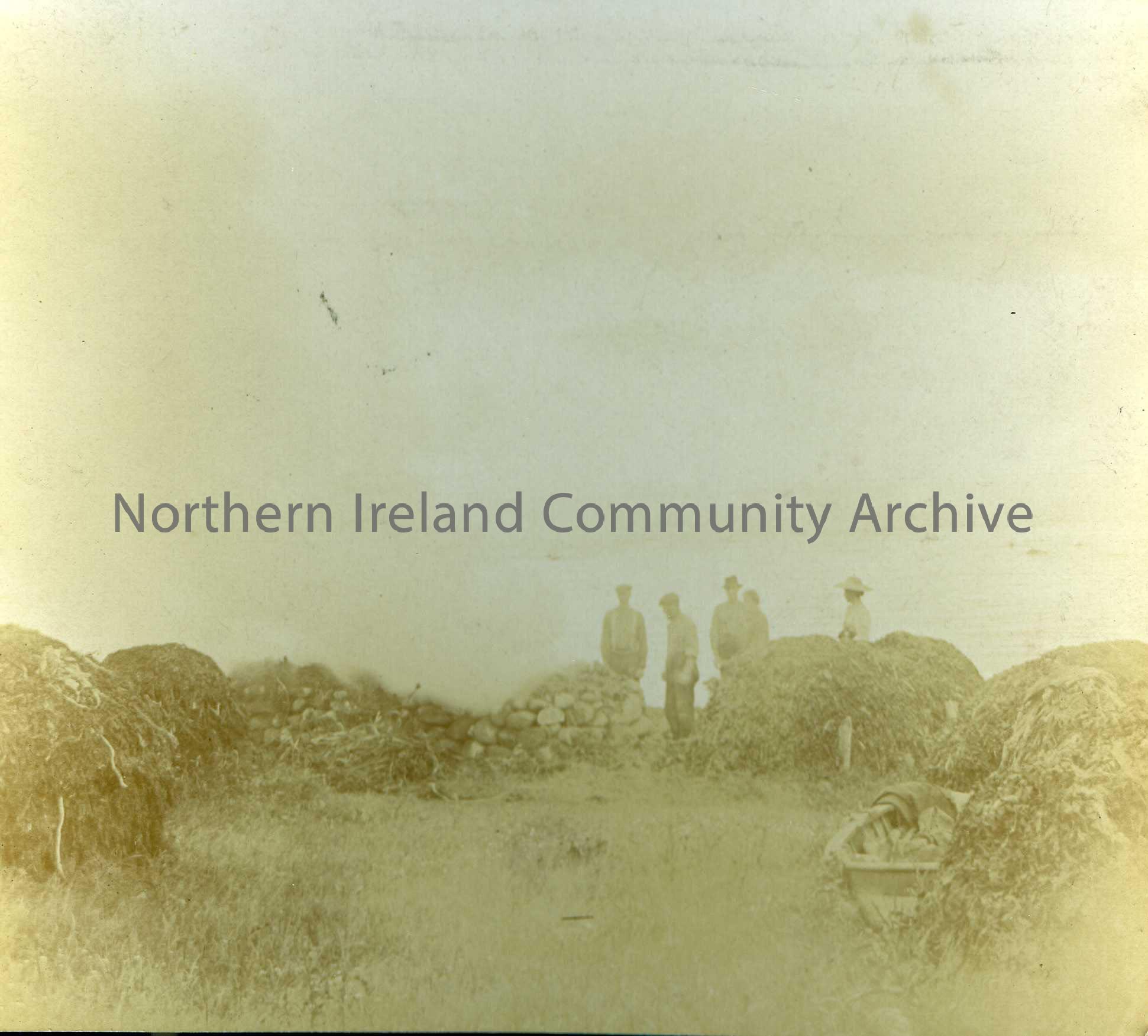 Photo of haystacks and what may be turf stacks. There is a group of men in the background.
