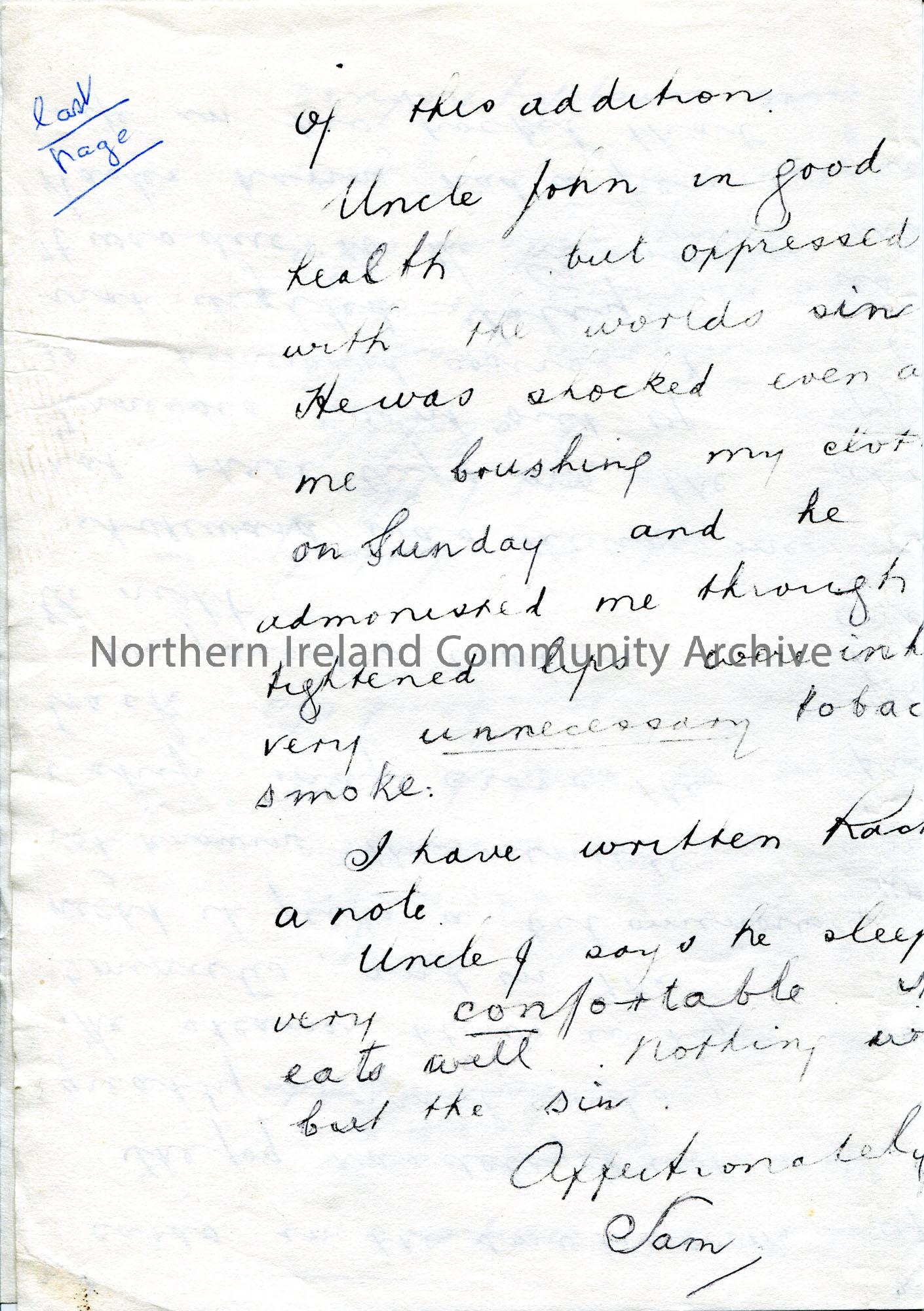 Photocopy of a letter from Sam Henry. Writing on board S S Furnessia. Sam is travelling with his Uncle John from Moville to New York. Writes of his ti… – scan020d