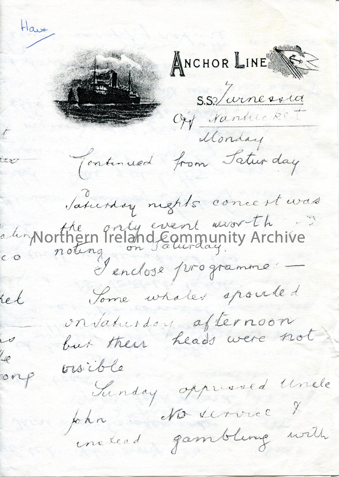 Photocopy of a letter from Sam Henry. Writing on board S S Furnessia. Sam is travelling with his Uncle John from Moville to New York. Writes of his time on board the ship and that he heard via marconigram that Coney Island has burnt down.