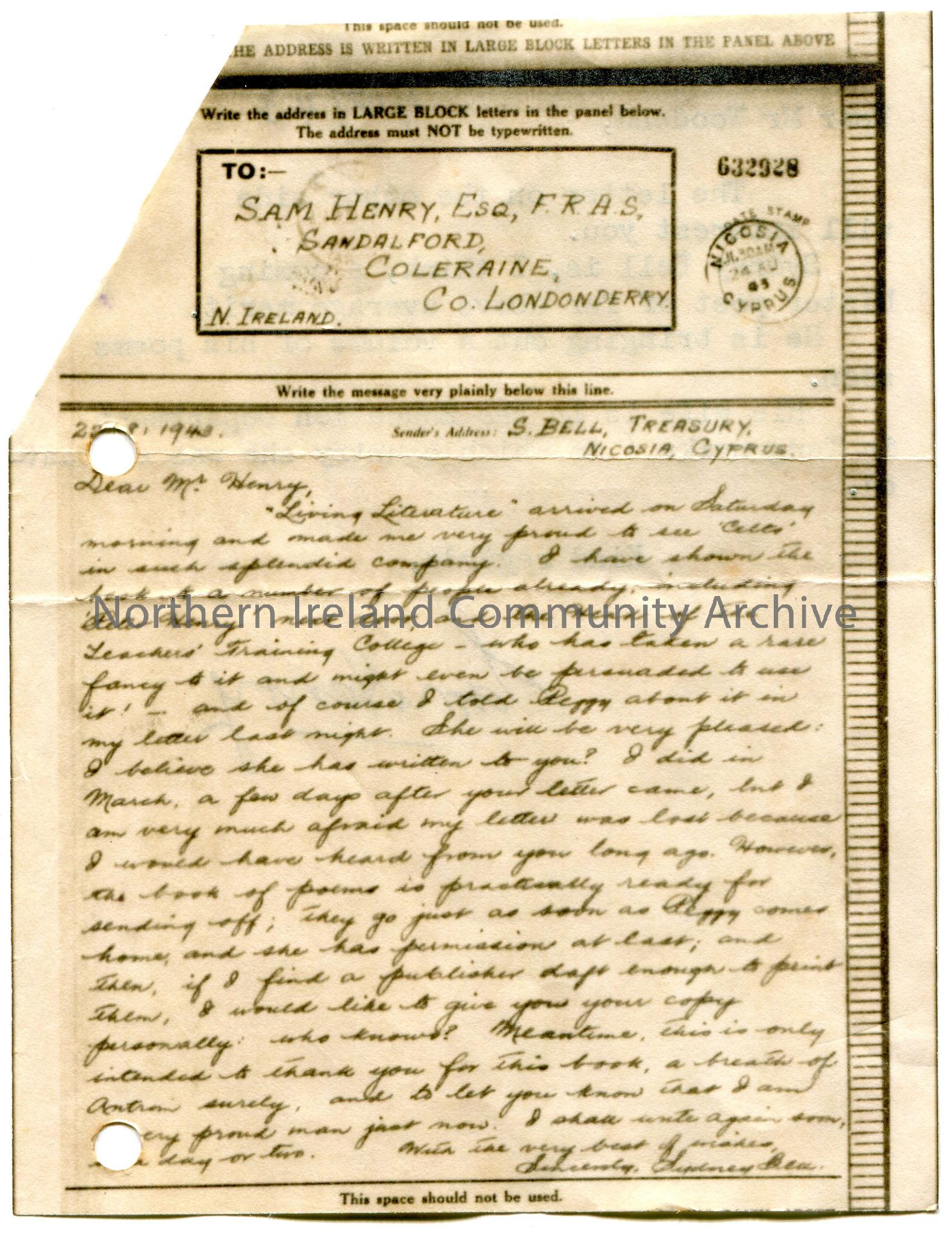 Photocopy of a letter to Sam Henry, Esq, F.R.A.S, Sandalford [Sandelford], Coleraine, Co.Londonderry. Thanks Sam for sending the 'Living Literature' book. He showed the book to 'Peter Henry next door' , head of the Teacher's Training College and told Peggy of it. Asks if Peggy has written to Sam. Writes of trying to publish a book of poems. Typed short note to Mr Woodend from Sam Henry, dated 1st October 1943. Writes that the letter will interest him. Sydney Bell to bring out volume of his poems whose wife is in the Education Department in Tanganyika.