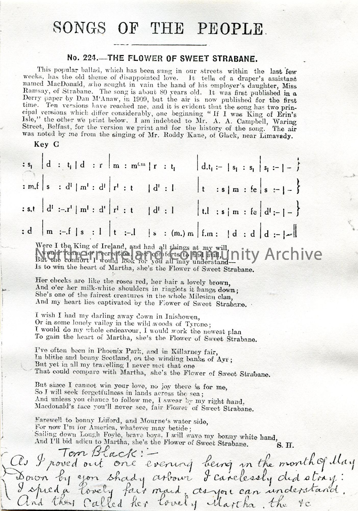 Photocopy of a Songs of the People article. Tonic sol-fa and words to song titled, 'No. 224 - The Flower of Sweet Strabane'. This version of the song and history of it was contributed by Mr A. A. Campbell, Belfast. Air noted from Mr Roddy Kane of Glack, near Limavady.