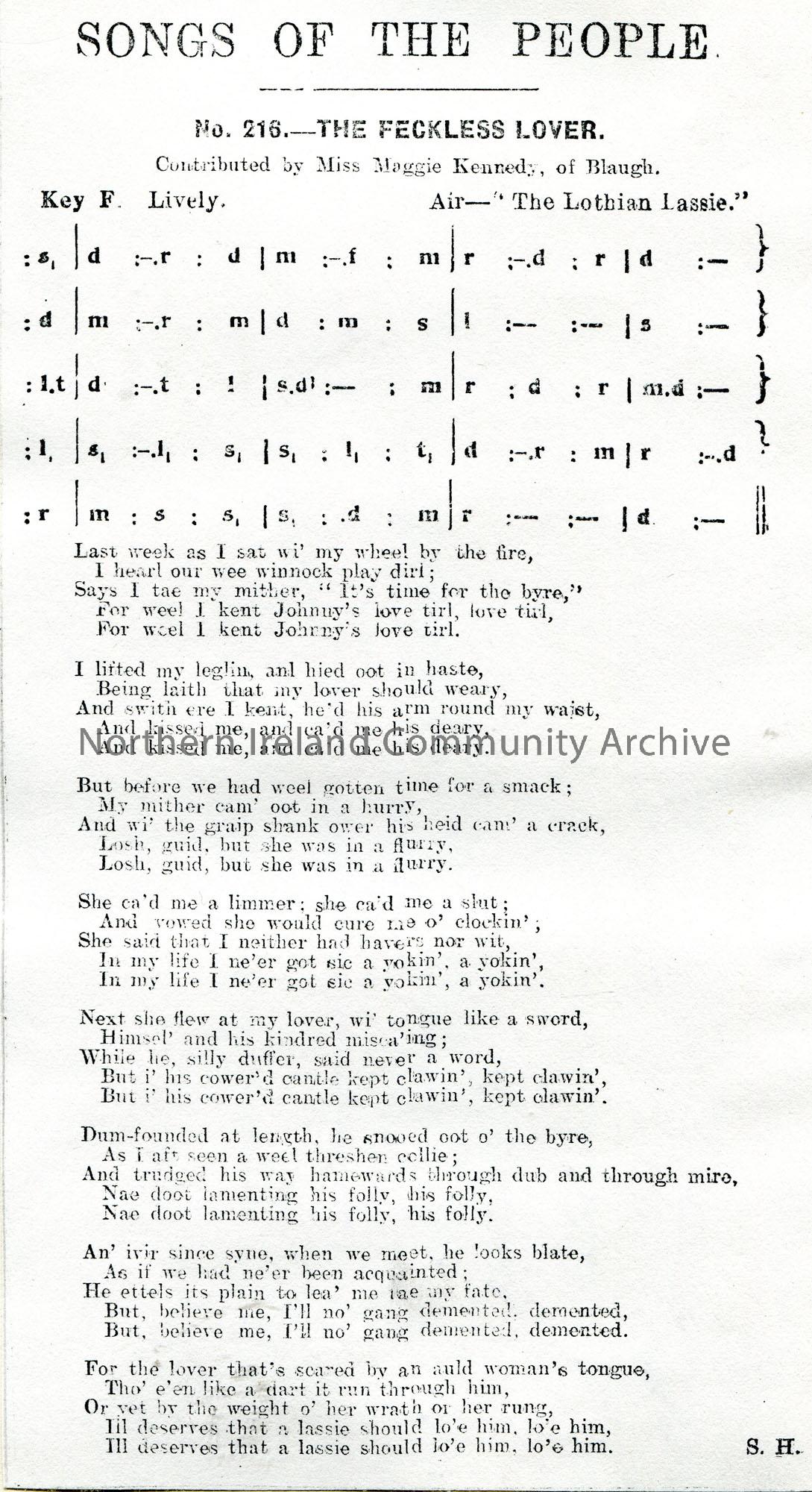 Photocopy of a Songs of the People article. Tonic sol-fa notation and words to song titled, 'No. 216 - The Feckless Lover'. Contributed by Miss Maggie Kennedy, Blagh, Cloyfin, Coleraine. Air - The Lothian Lassie.