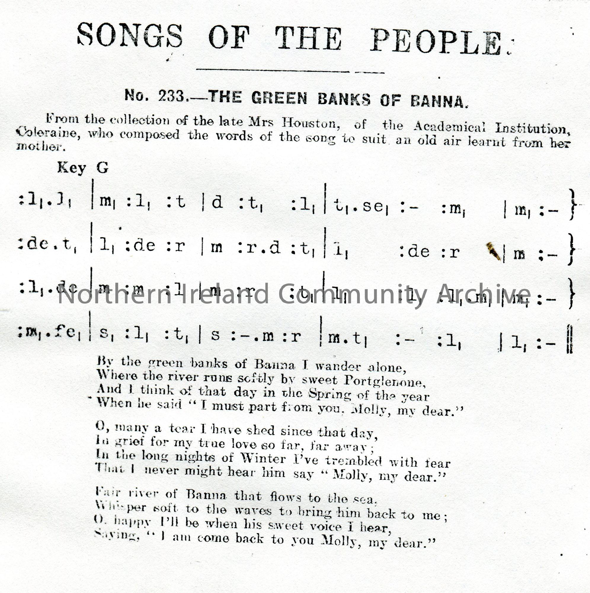 Photocopy of a Songs of the People article. Tonic sol-fa notation and words to song titled, 'No. 233 - The Green Banks of Banna'. From the collection of Mrs Houston, Coleraine, who composed the words of the song to suit an old air learnt from her mother.