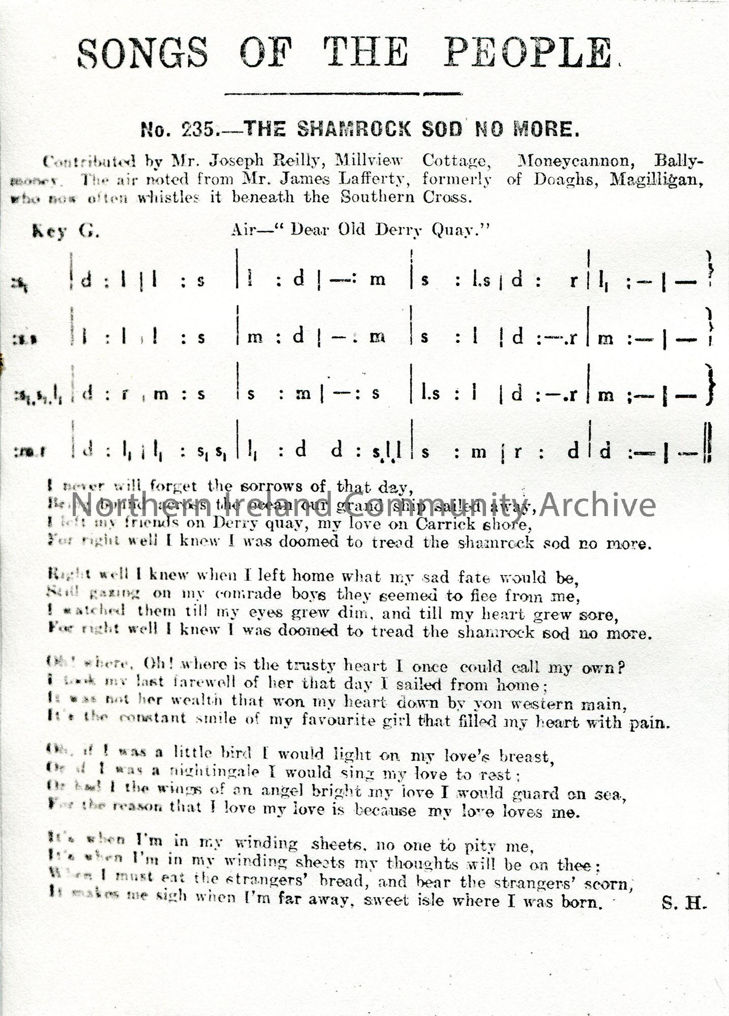 Photocopy of a Songs of the People article. Tonic sol-fa notation and words to song titled, 'No. 235 - The Shamrock Sod No More'. Contributed by Mr Joseph Reilly, Millview Cottage, Moneycannon, Ballymoney. Air from James Lafferty, formerly of Doaghs, Magilligan.