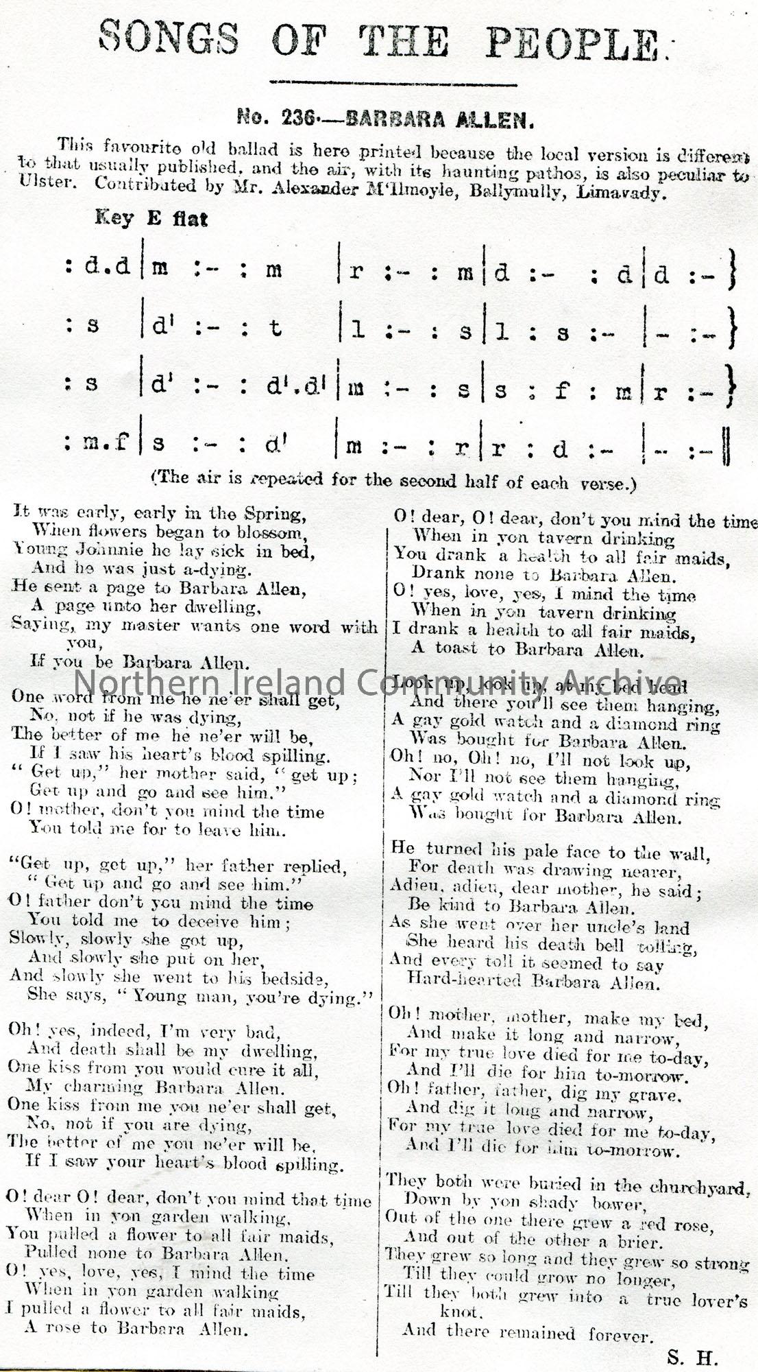 Photocopy of a Songs of the People article. Tonic sol-fa notation and words to song titled, 'No. 236 - Barbara Allen'. Contributed by Mr Alexander M'Ilmoyle, Ballymully, Limavady.