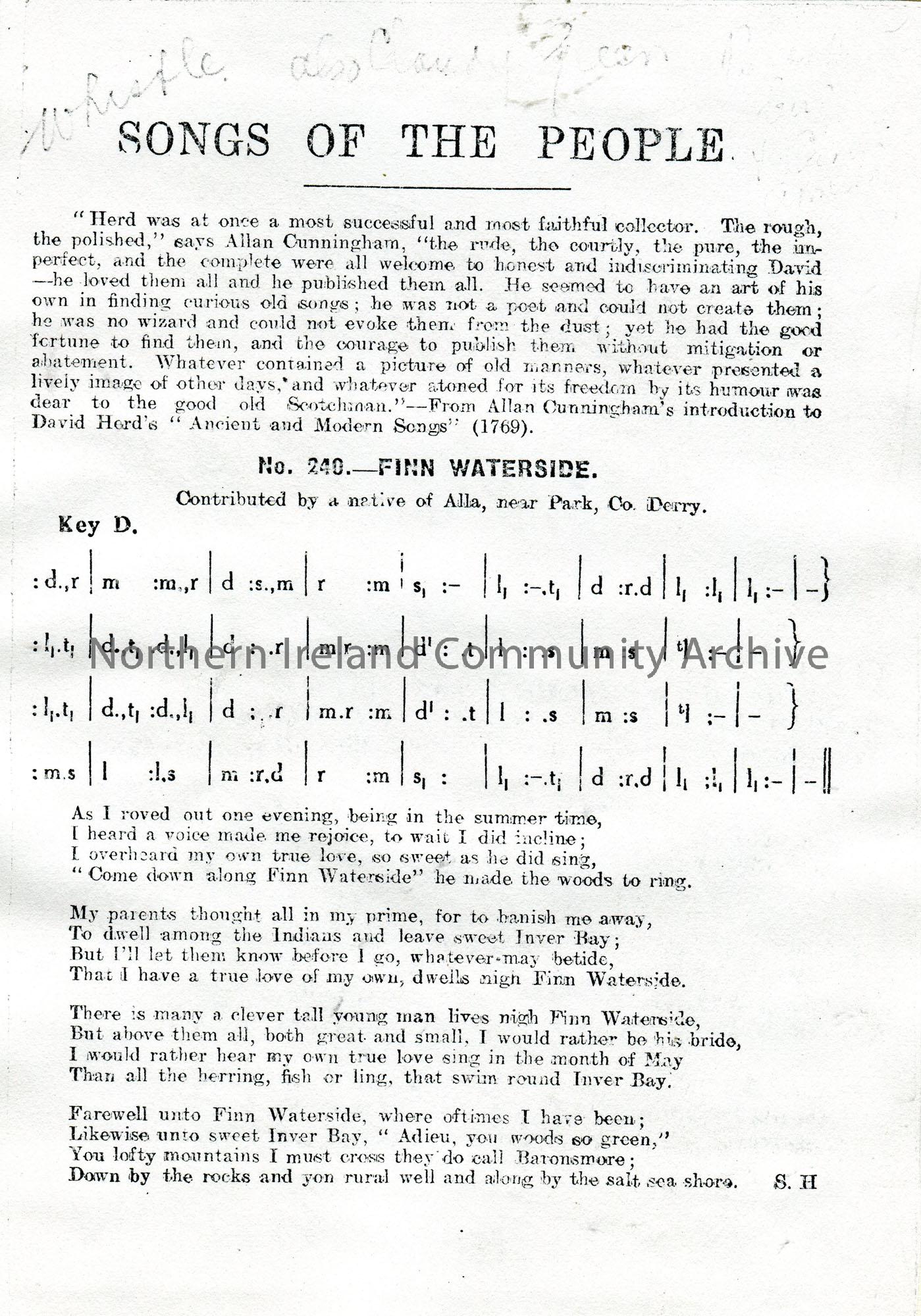 Photocopy of a Songs of the People article. Tonic sol-fa notation and words to song titled, 'No. 240 - Finn Waterside'. Contributed by a native of Alla, near Park, Co. Derry.