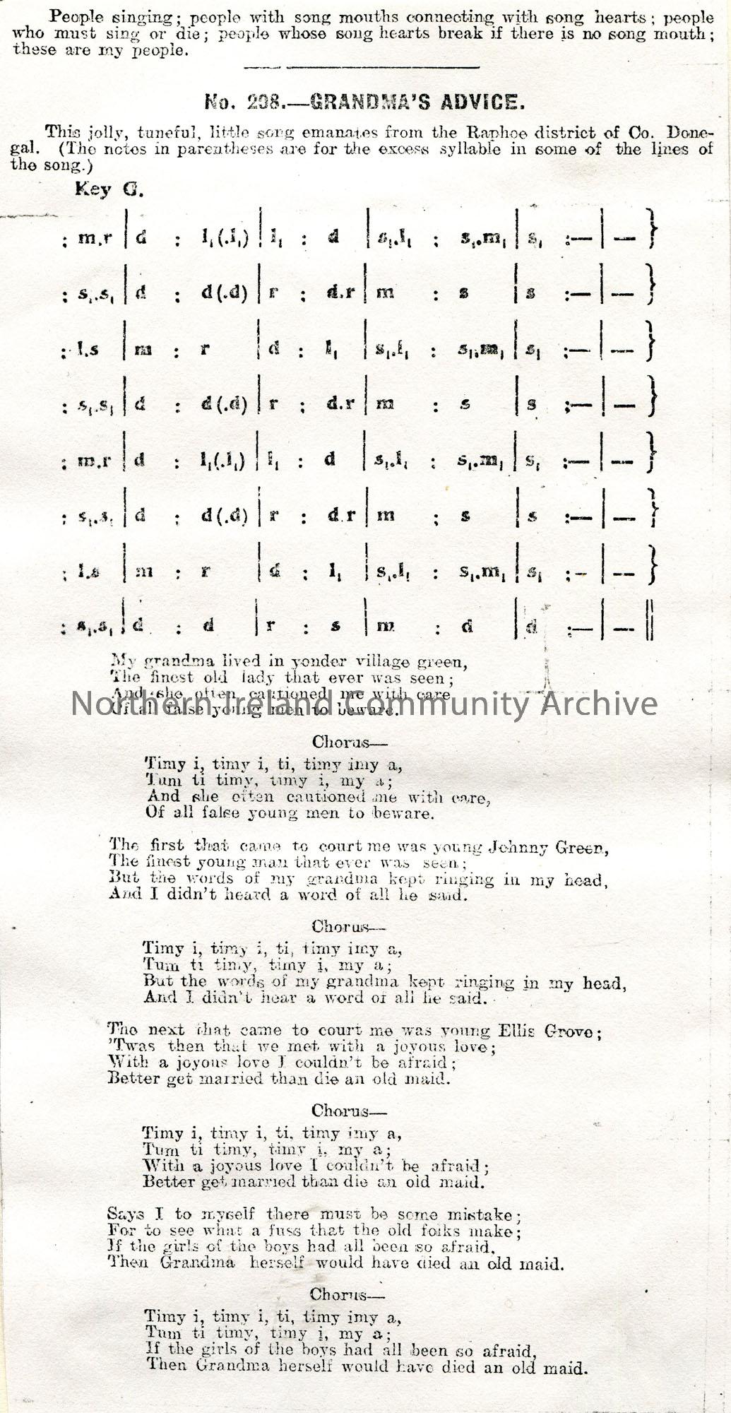 Photocopy of a Songs of the People article. Typed tonic sol-fa notation and words to song titled, 'No. 208 - Grandma's Advice'. Originated from the Raphoe district of Co. Donegal.