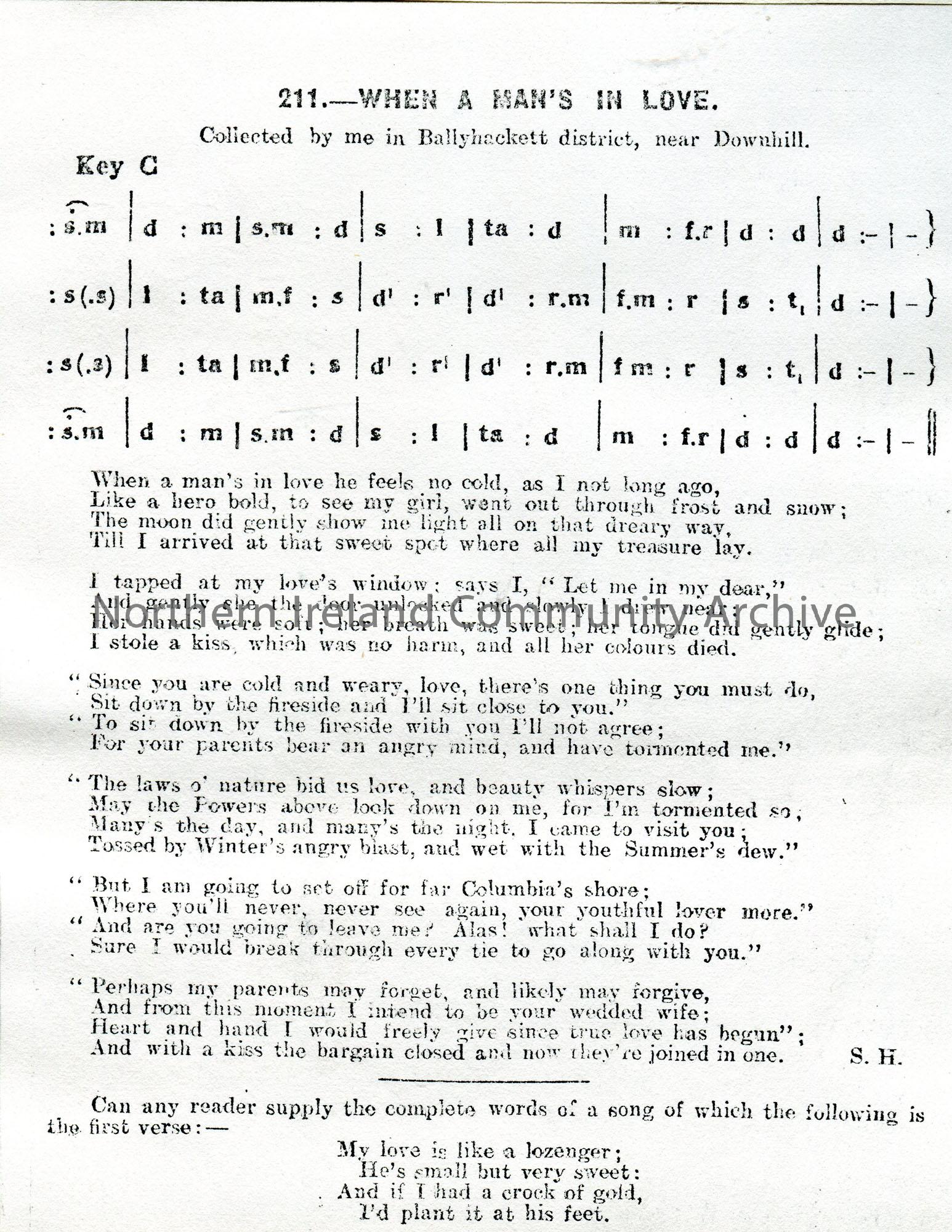 Photocopy of a tonic sol-fa notation and words to song titled, ‘No 211 – When a Man’s in Love’. Collected from the Ballyhackett district, near Downhil…