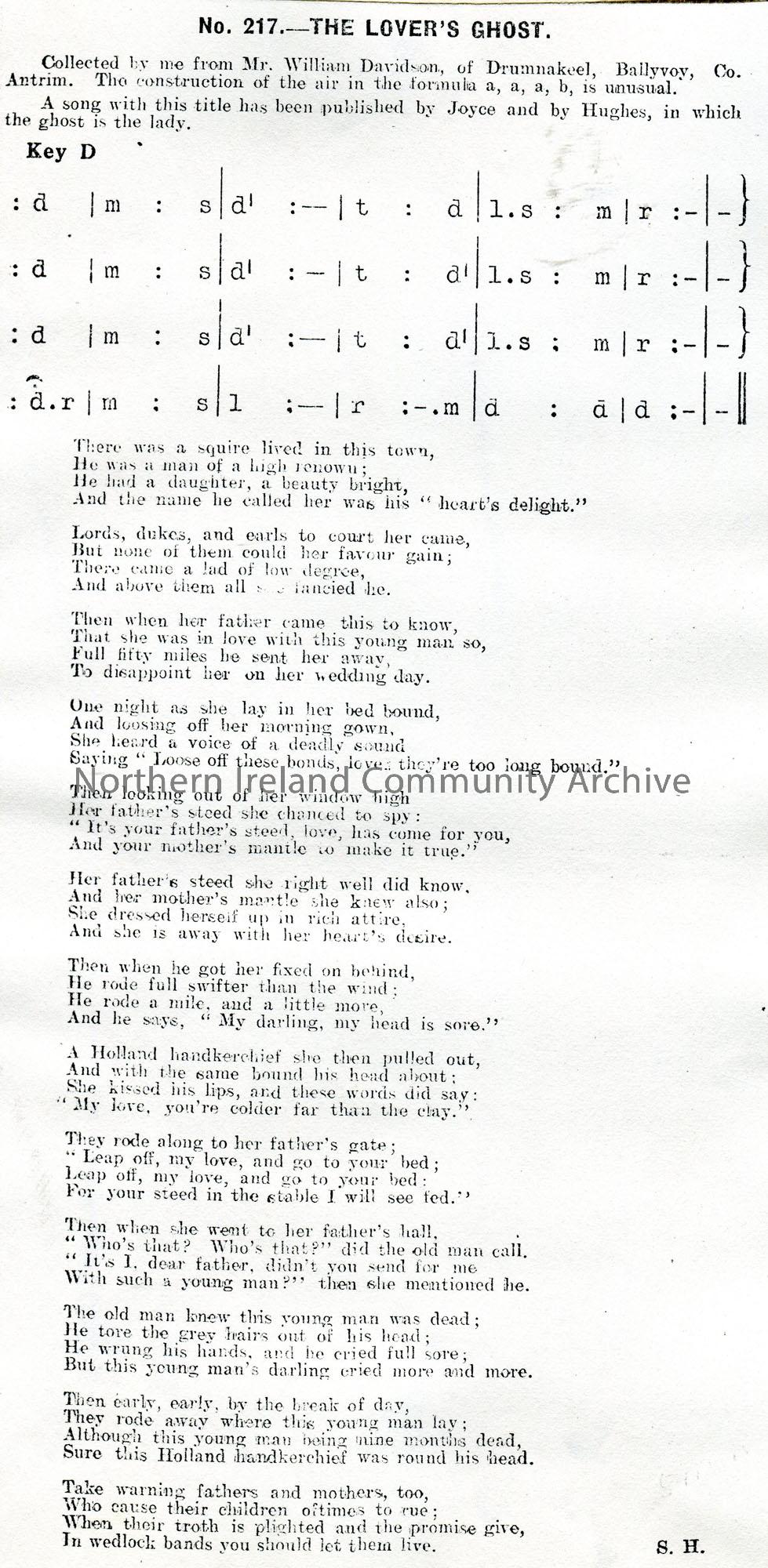 Photocopy of a tonic sol-fa notation and words to song titled, ‘No. 217 – The Lover’s Ghost’. Collected by Sam Henry from Mr William Davidson, Drumnak…