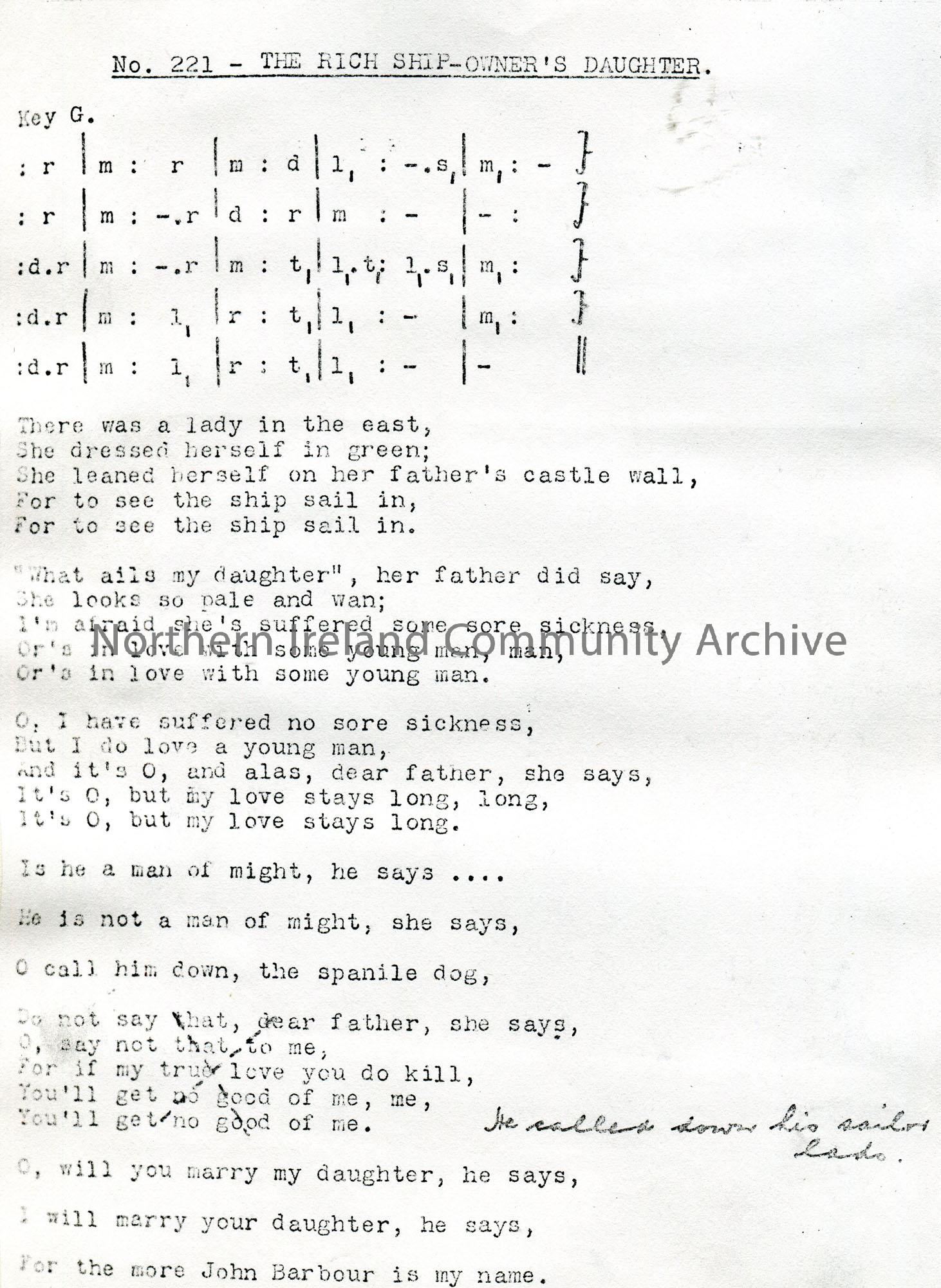 Photocopy of a tonic sol-fa notation and words to song titled, 'No. 221 - The Rich Ship-Owner's Daughter'. One verse scored out and one line handwritten.