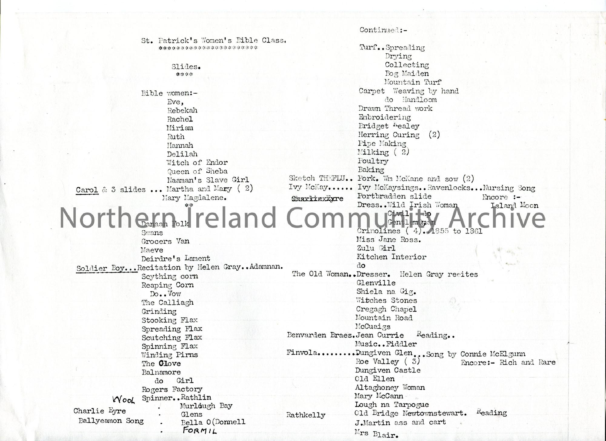Photocopy of a typed list titled, ‘St. Patrick’s Women’s Bible Class’. List of slides of varying subjects.