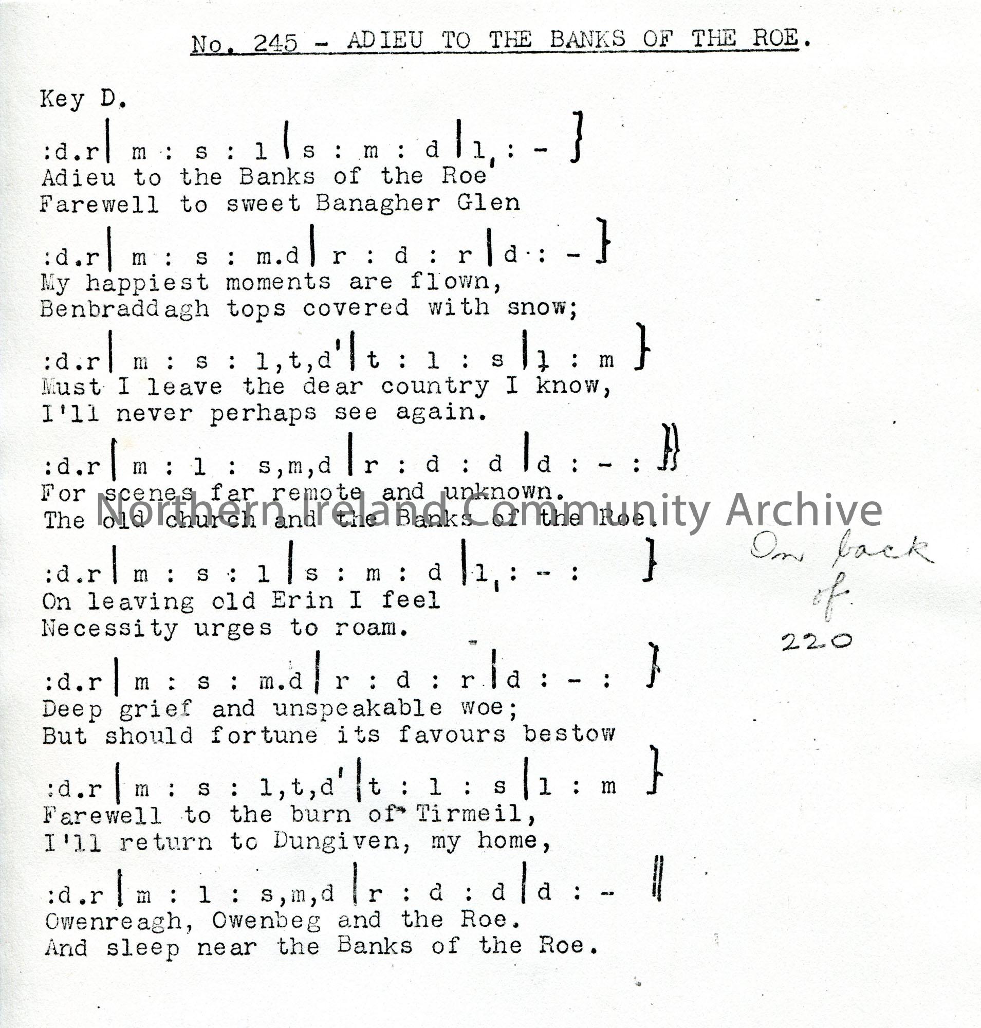 Photocopy of a typed tonic sol-fa notation and words to song titled, ‘Adieu to the Banks of the Roe’.