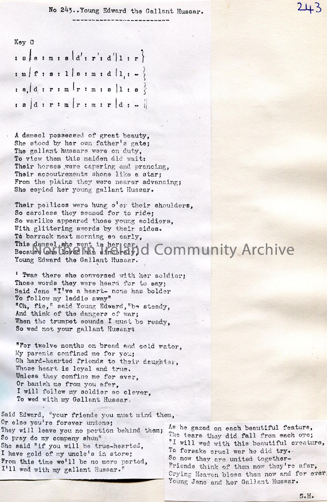 Photocopy of a typed tonic sol-fa notation and words to song titled, ‘No. 243 – Young Edward the Gallant Hussar’.