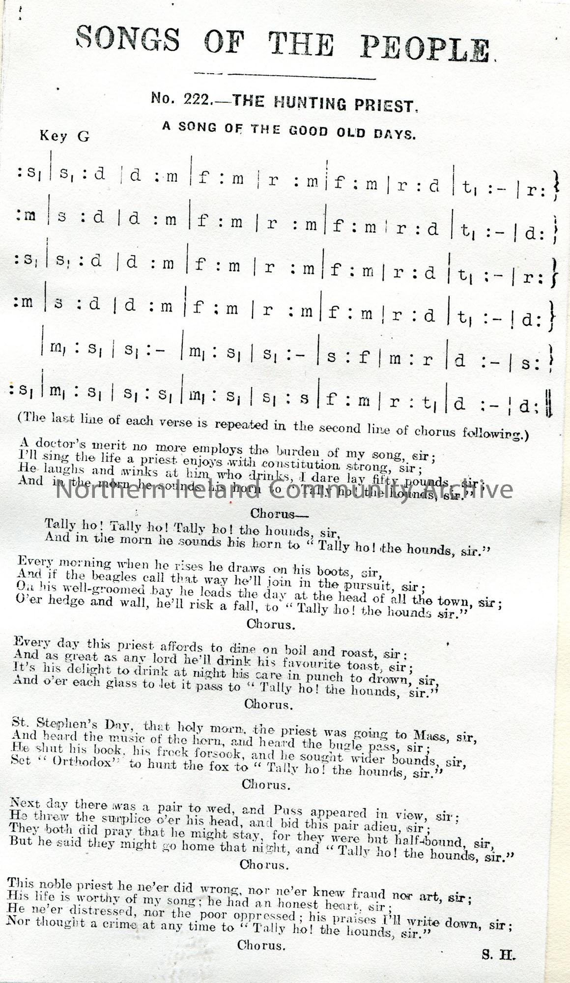 Photocopy of Songs of the People article. Tonic sol-fa notation and words to song titled, 'No. 222 - The Hunting Priest, A Song of the Good Old Days'.