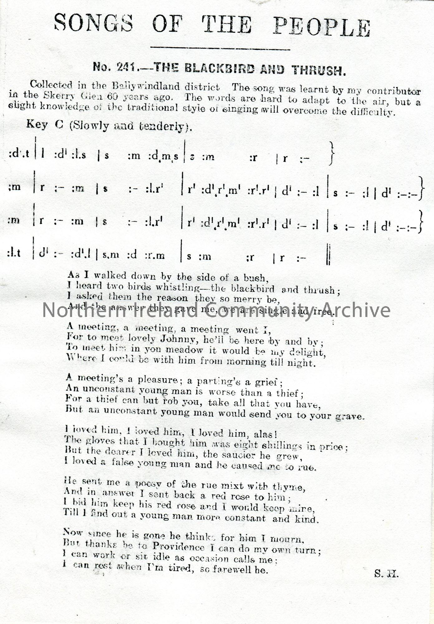 Photocopy of Songs of the People article. Tonic sol-fa notation and words to song titled, 'No. 241 - The Blackbird and Thrush'. Collected in the Ballywindland district. The song was learnt by the contributor in the Skerry Glen.