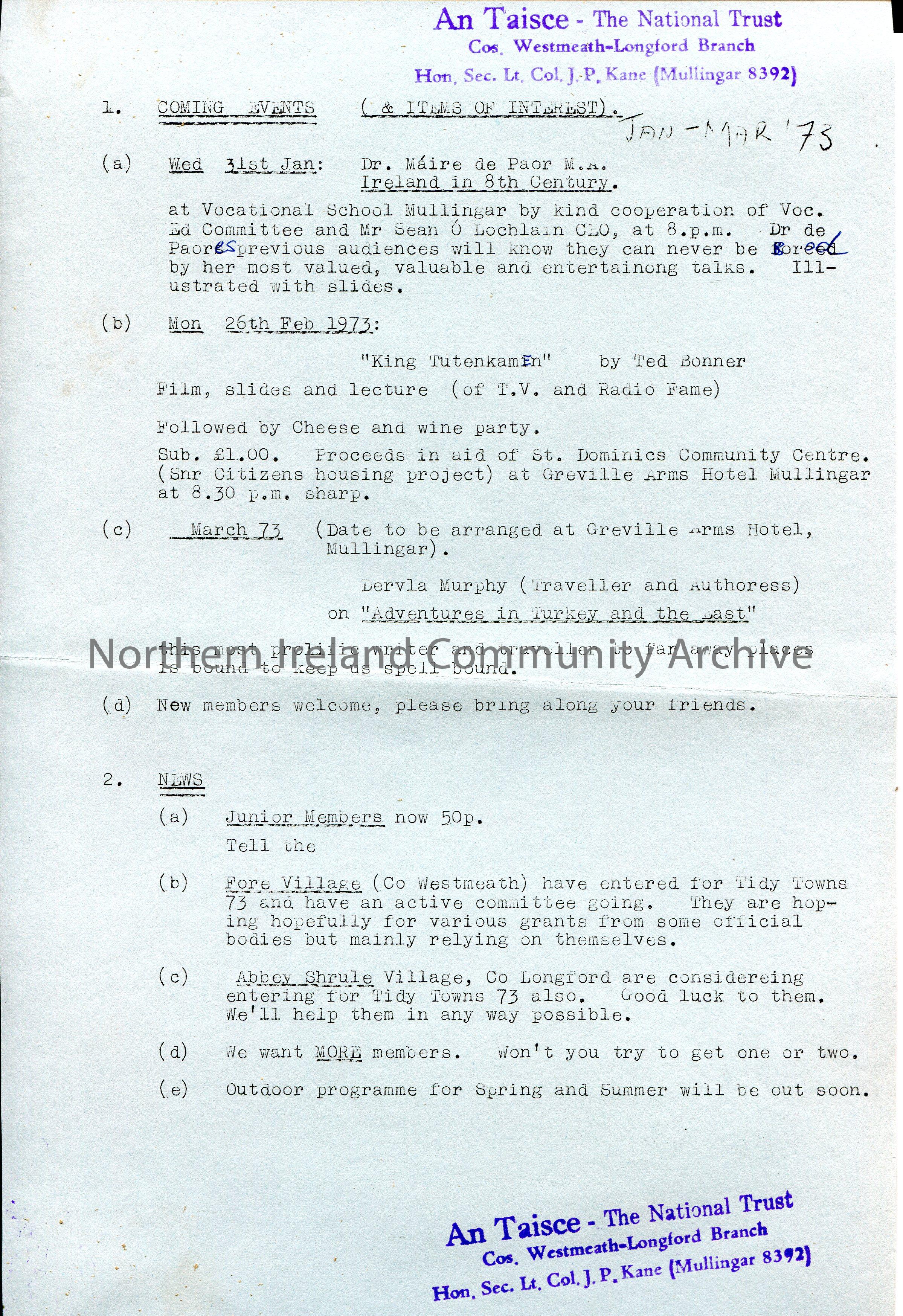 Photocopy (on blue paper) of a typed list of events January – March 1973 and news items of ‘An Taisce – The National Trust’. ‘An Taisce’ stamp at top …